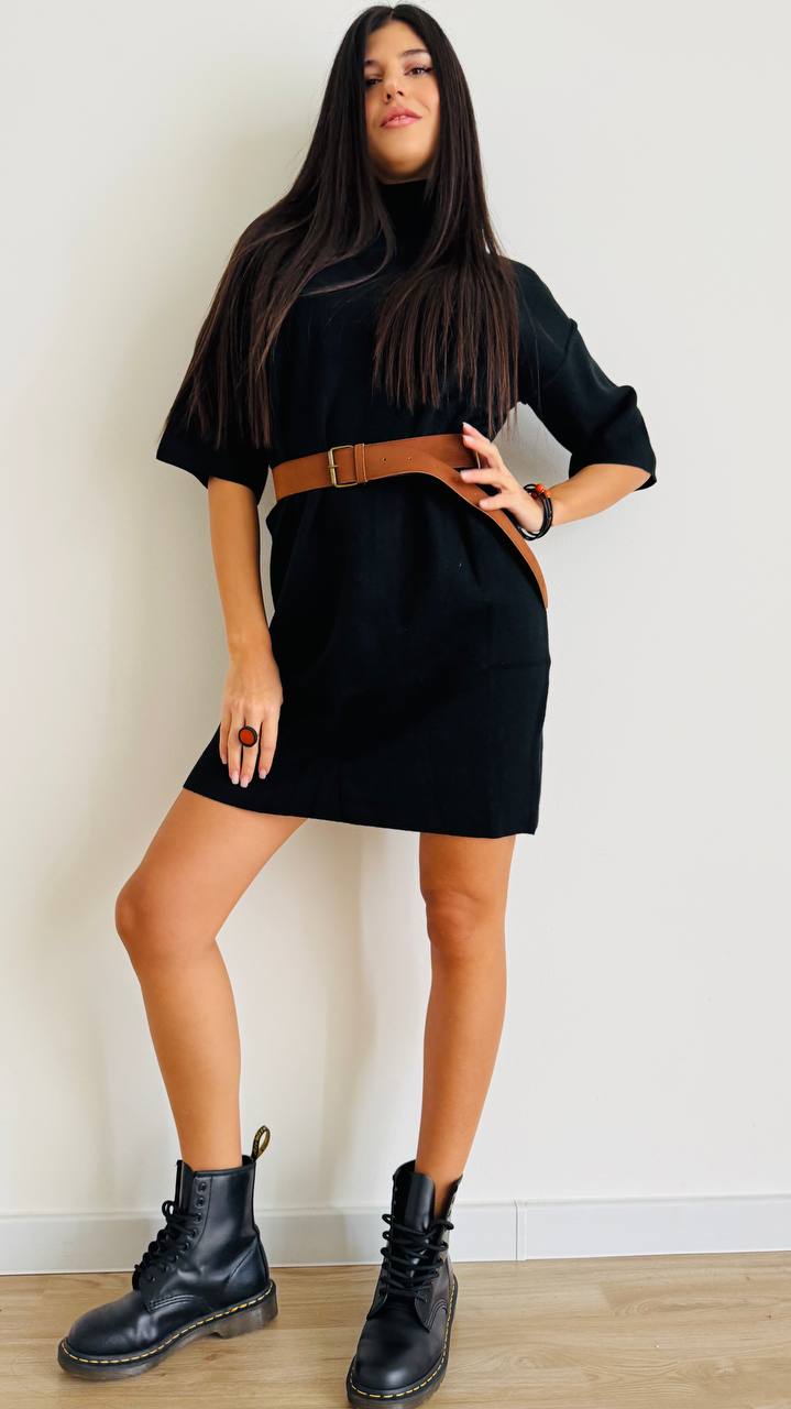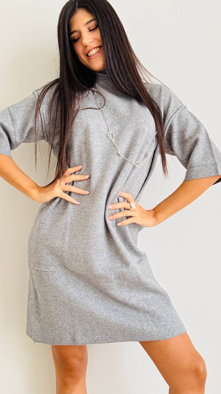 Abitino con collo a vulcano e manica sotto il gomito realizzato in maglia di viscosa morbida e comoda. Linea dritta e tasglia unica fino alla 46.