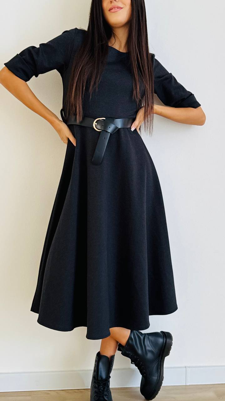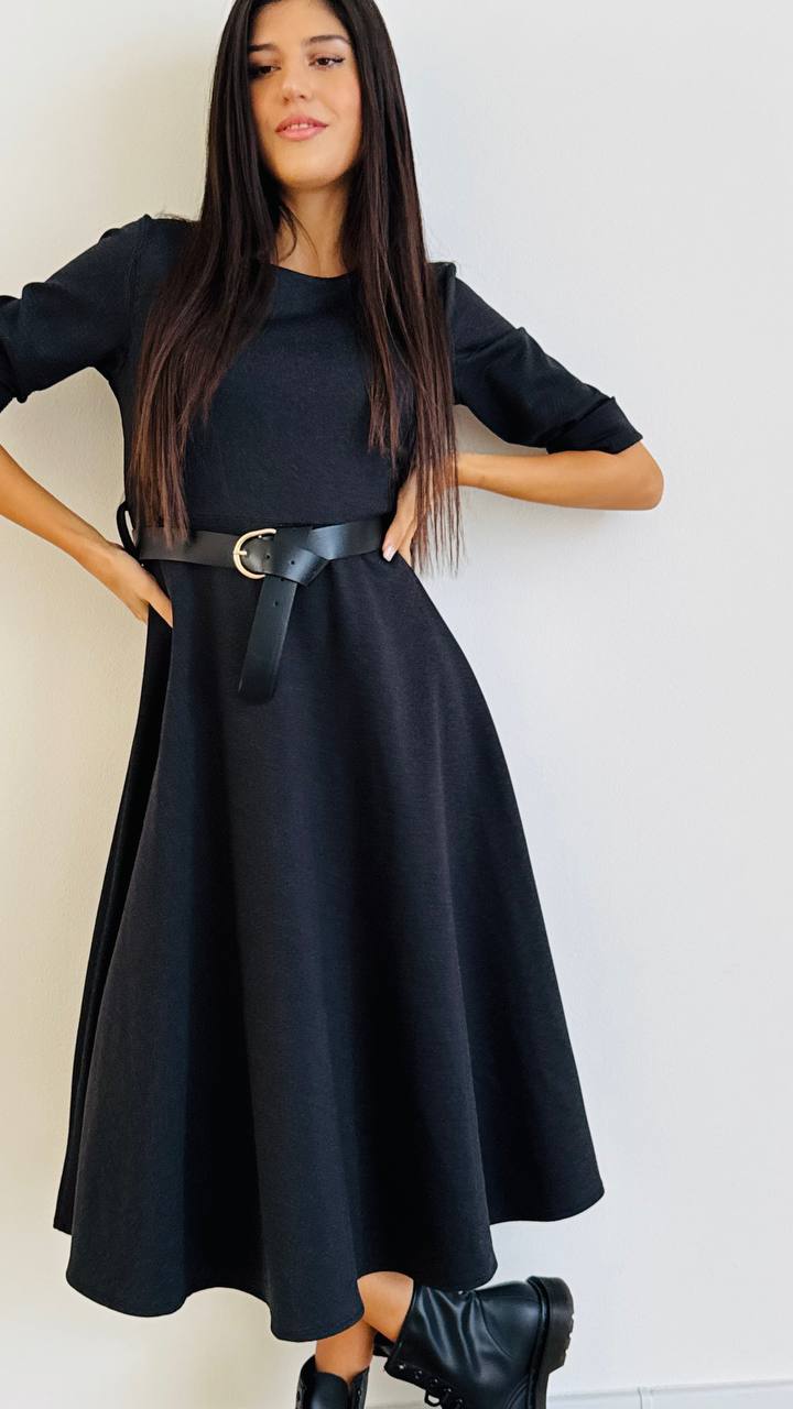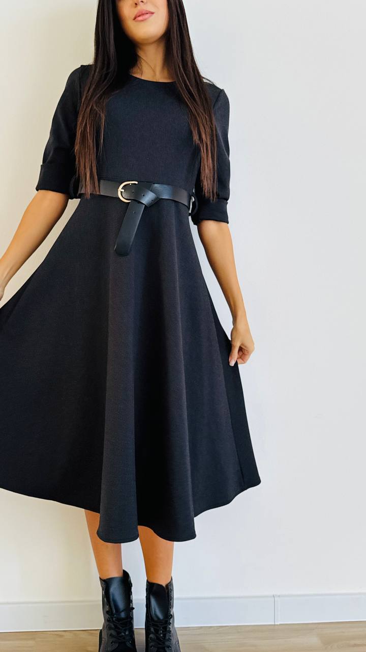 Abitino midi a ruota con corpetto più ascutto e gonna svasata realizzato in misto viscosa. Taglia unica consigliata fino alla 46. Made in Italy