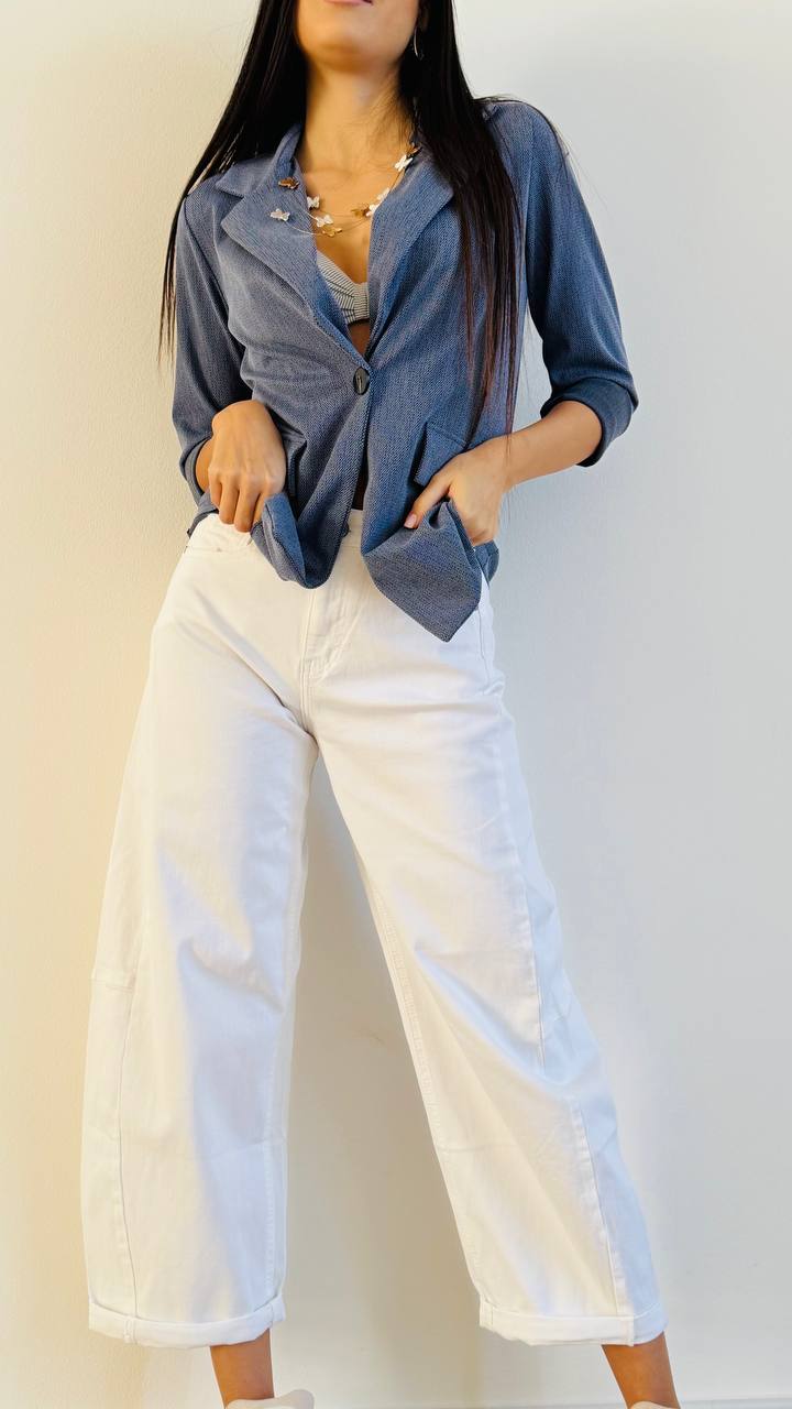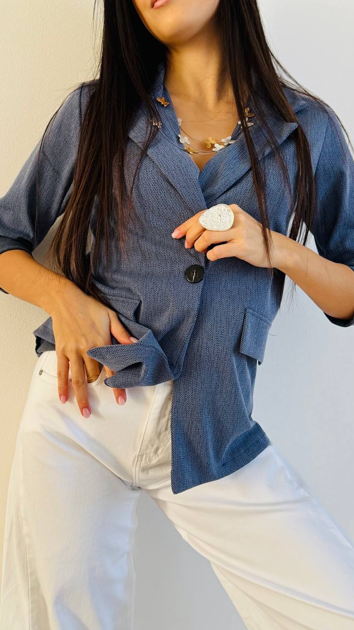 Blazer con chiusura ad un bottone realizzato in pl e poliamide leggermente elasticizzato microfantasia Made in Italy
