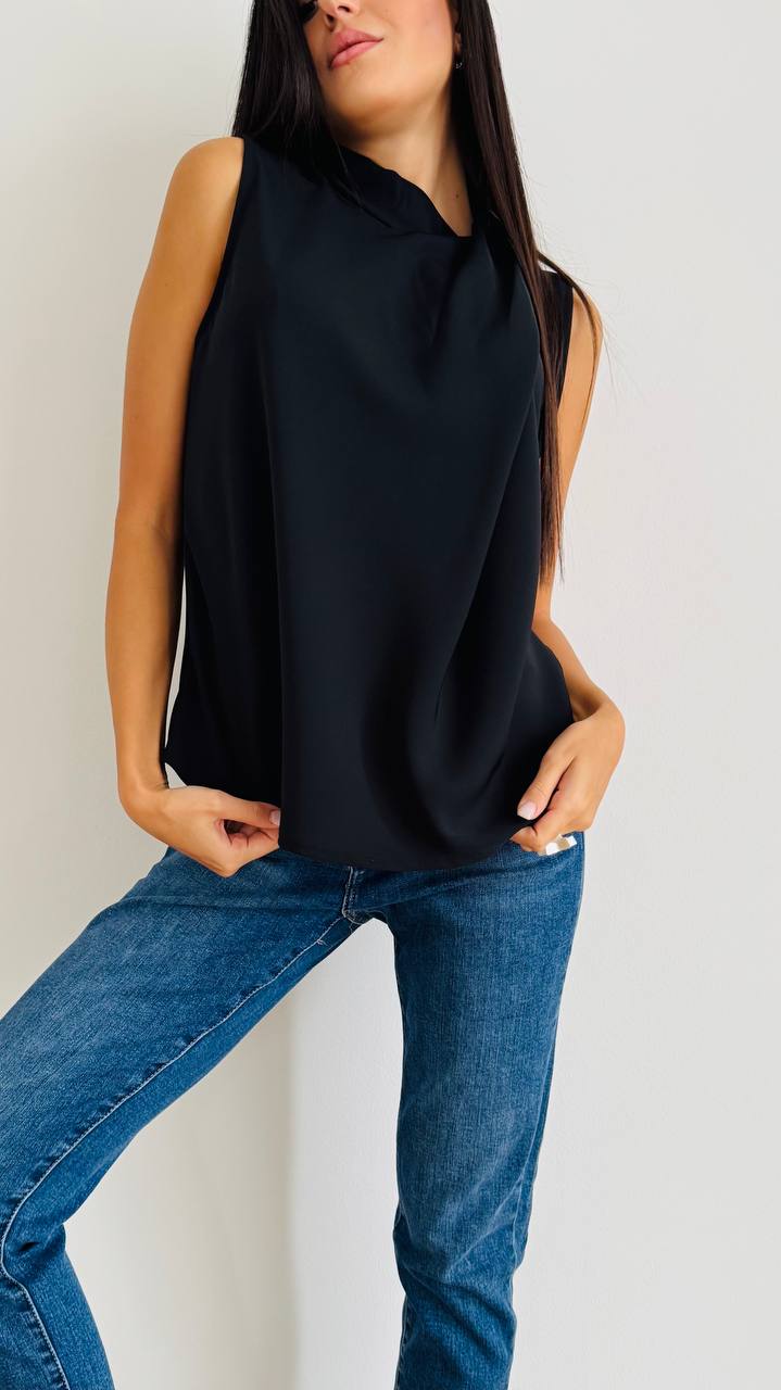 Blusina a collo alto con chiusura a bottoni e motivo frontale realizzata in crepe. taglia unica consigliata fino alla 46. Made in Italy