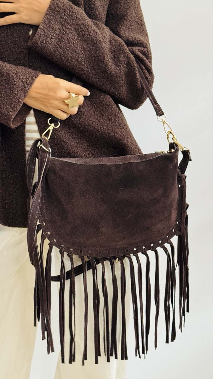 Borsa mezzaluna con frange realizzata in vera pelle scamosciata con chiusura a cerniera e doppio manico intercambiabile.