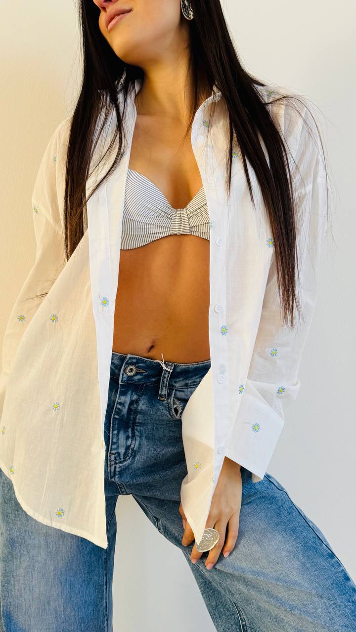 Camicia realizzata in 100% mussola di cotone con dettagli ricamati. Vestibilità morbida con taglia unica fino alla 46.