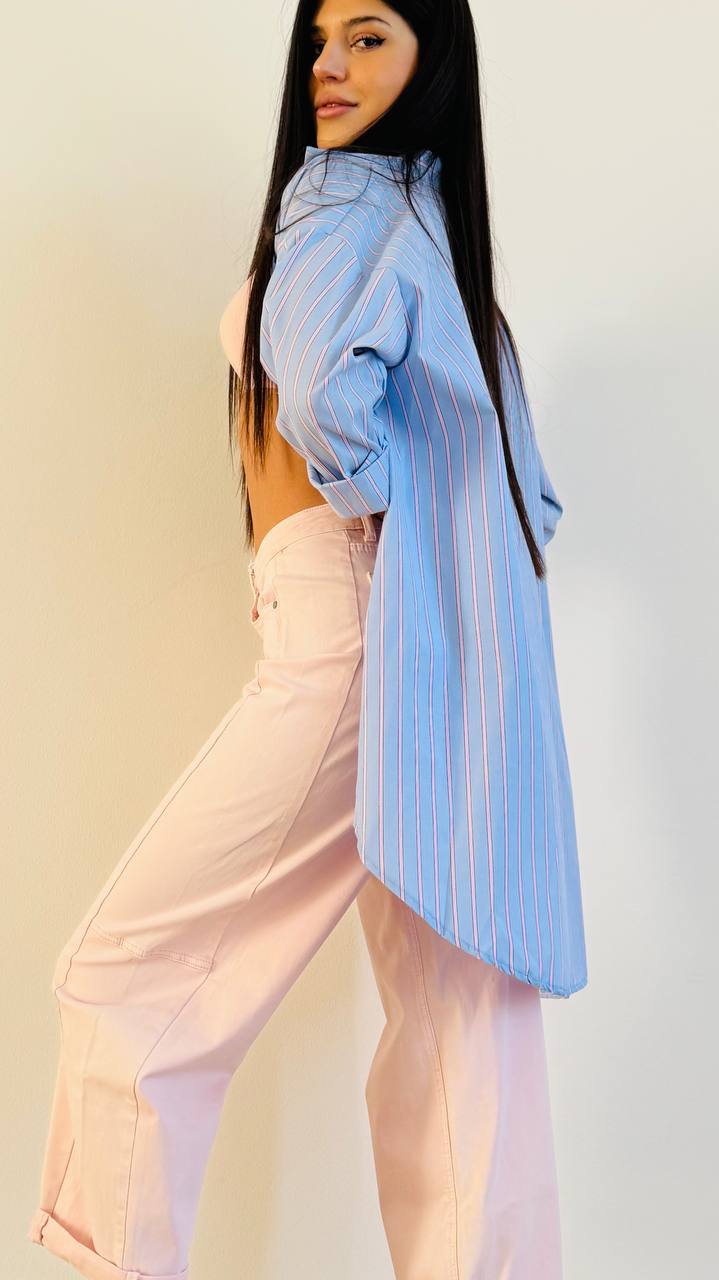 Camicia dalle linee aschili con bottoni nascosti realizzata in misto cotone in fantasia bacchettata. Taglia unica consigliata fino alla 46. Made in Italy.