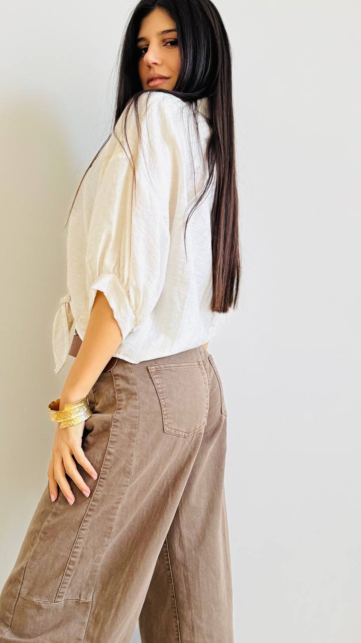 Camicia realizzata in cotone, ny e lino con ricami traforati, chiusura a bottone e manica a sbuffo. taglia unica consigliata fino alla 46.
