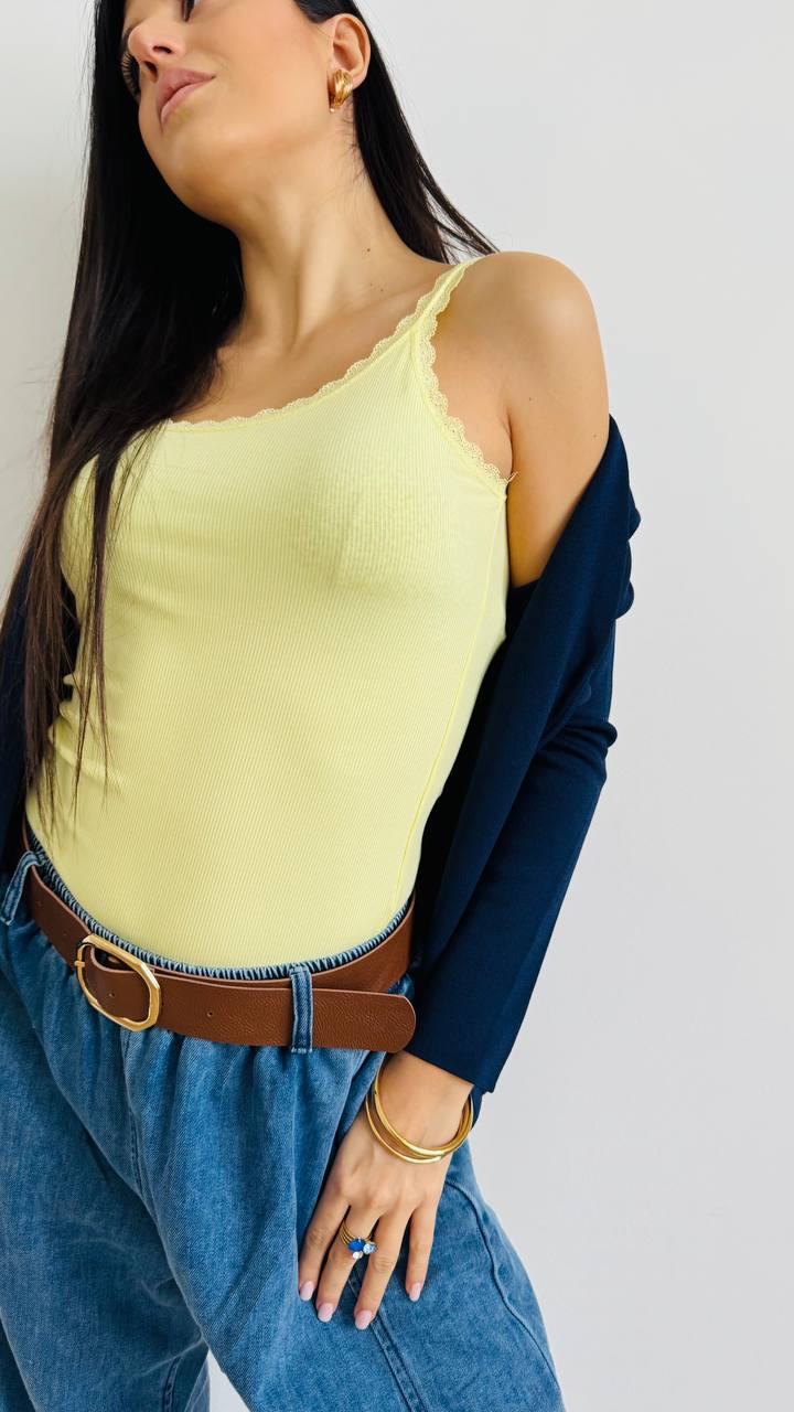 Canottina realizzata in viscosa leggermente elasticizzata con profoili in pizzo. Taglia unica consigliata fino alla 44.