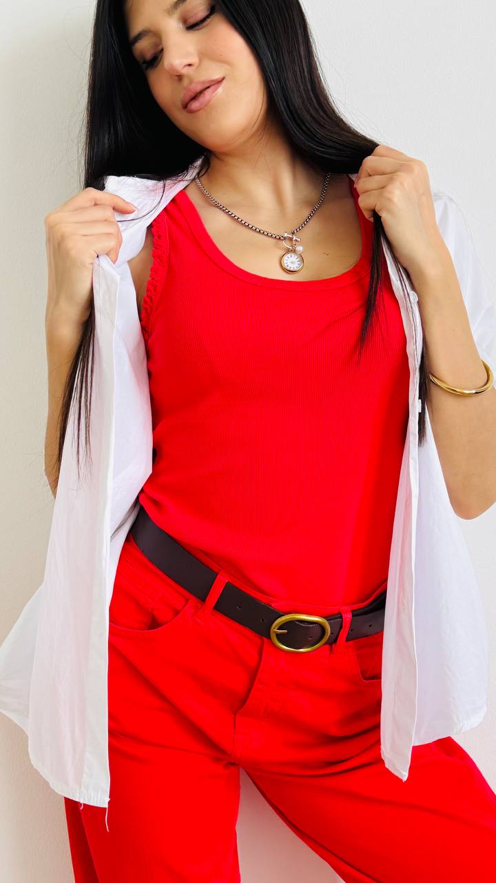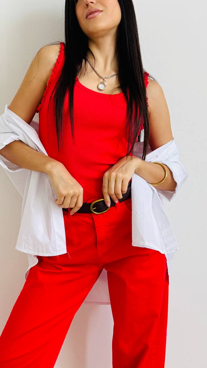 Canottina realizzata in cotone leggermente elasticizzato con dettagli in pizzo sui profili. taglia unica consigliata fino alla 44/46. made in Italy.