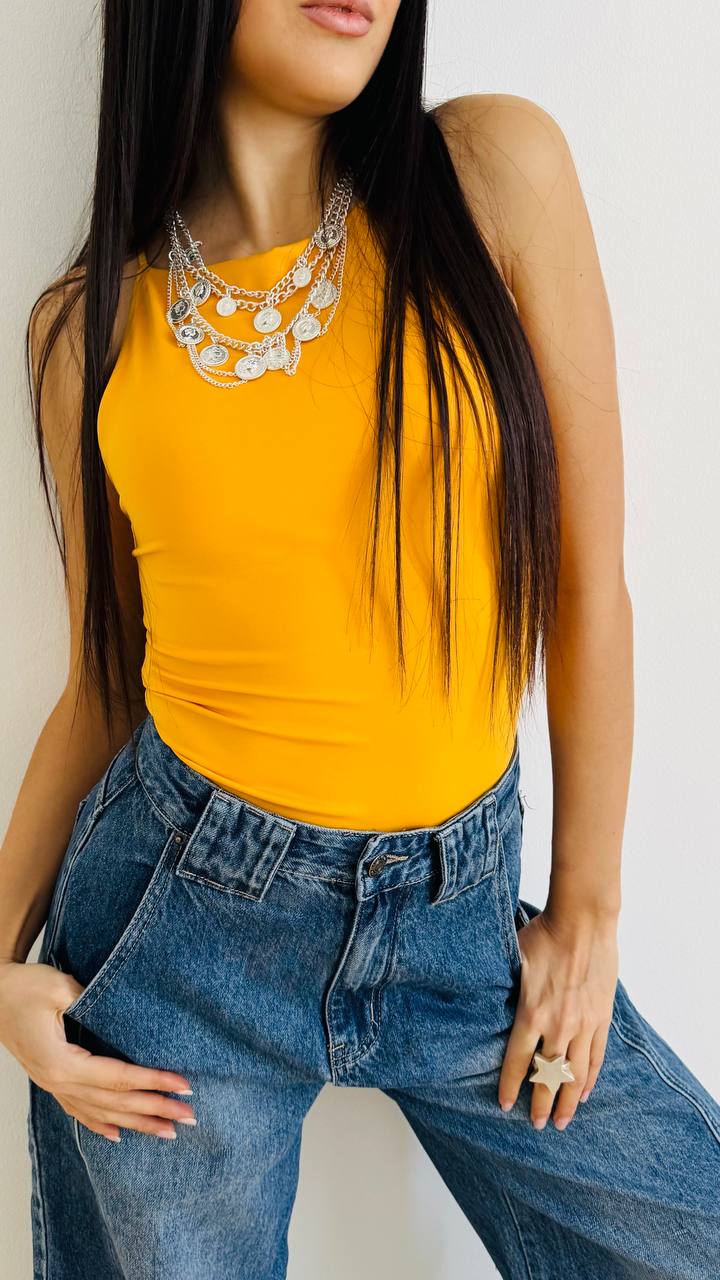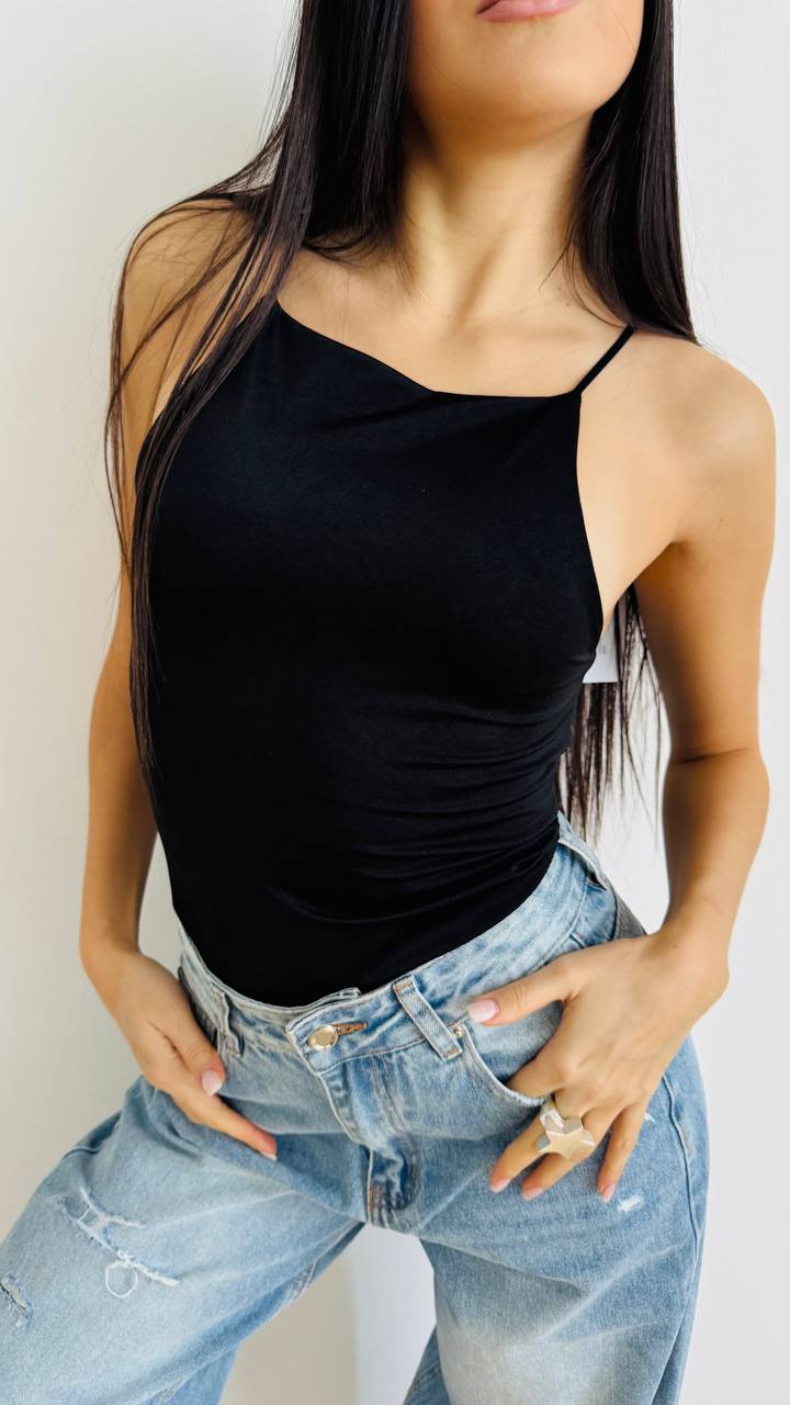 Canottina con scollo dritto realizzata in lycra con spallina sottile. Taglia unica consigliata fino alla 44.