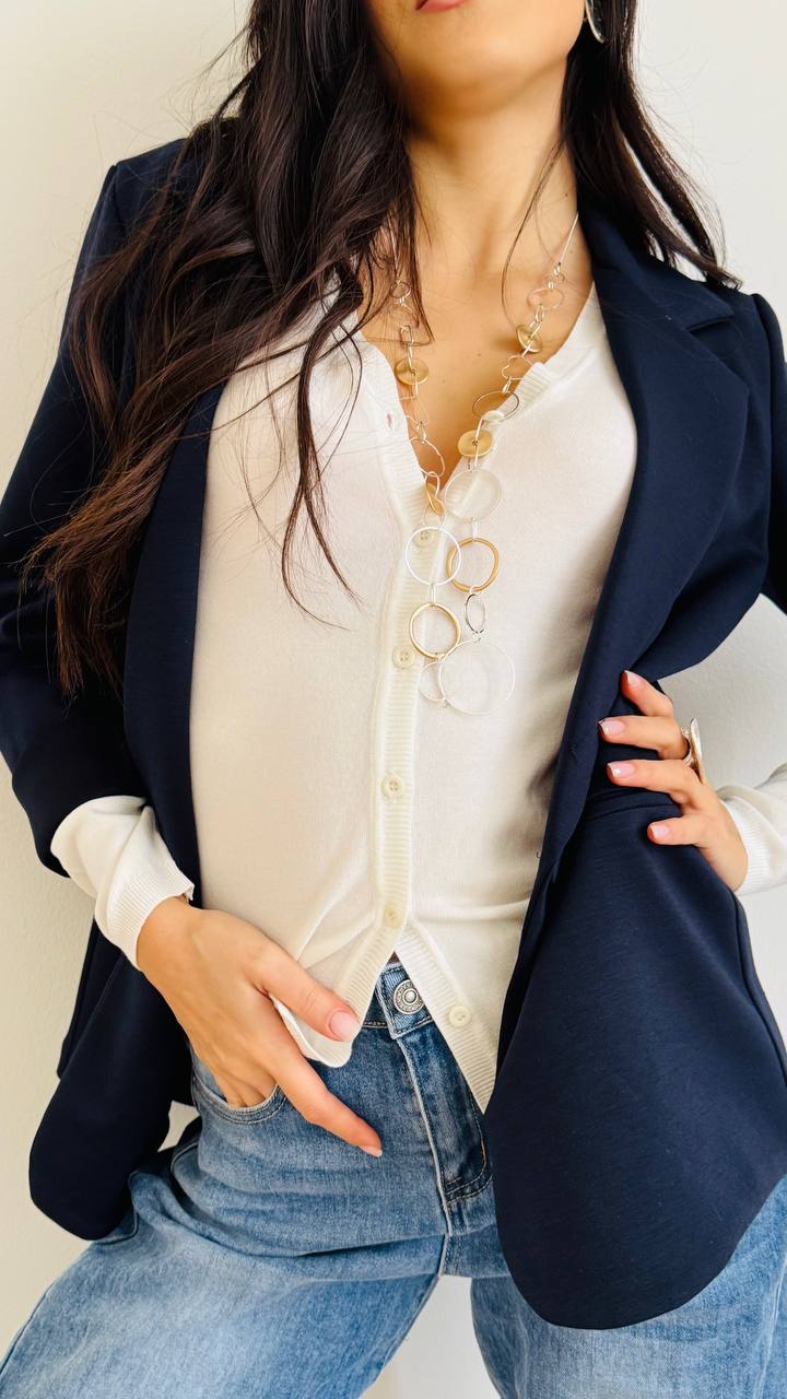 Cardigan semplice con bottoni realizzato in misto viscosa dalle linee classiche. taglia unica consigliata fino alla 46.