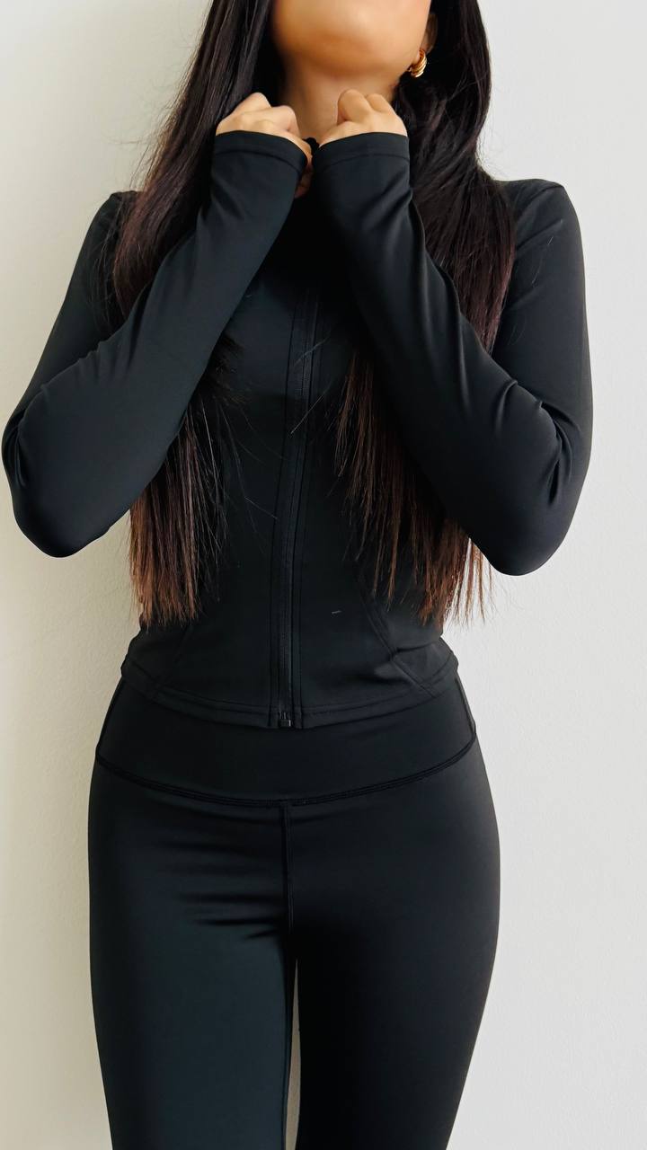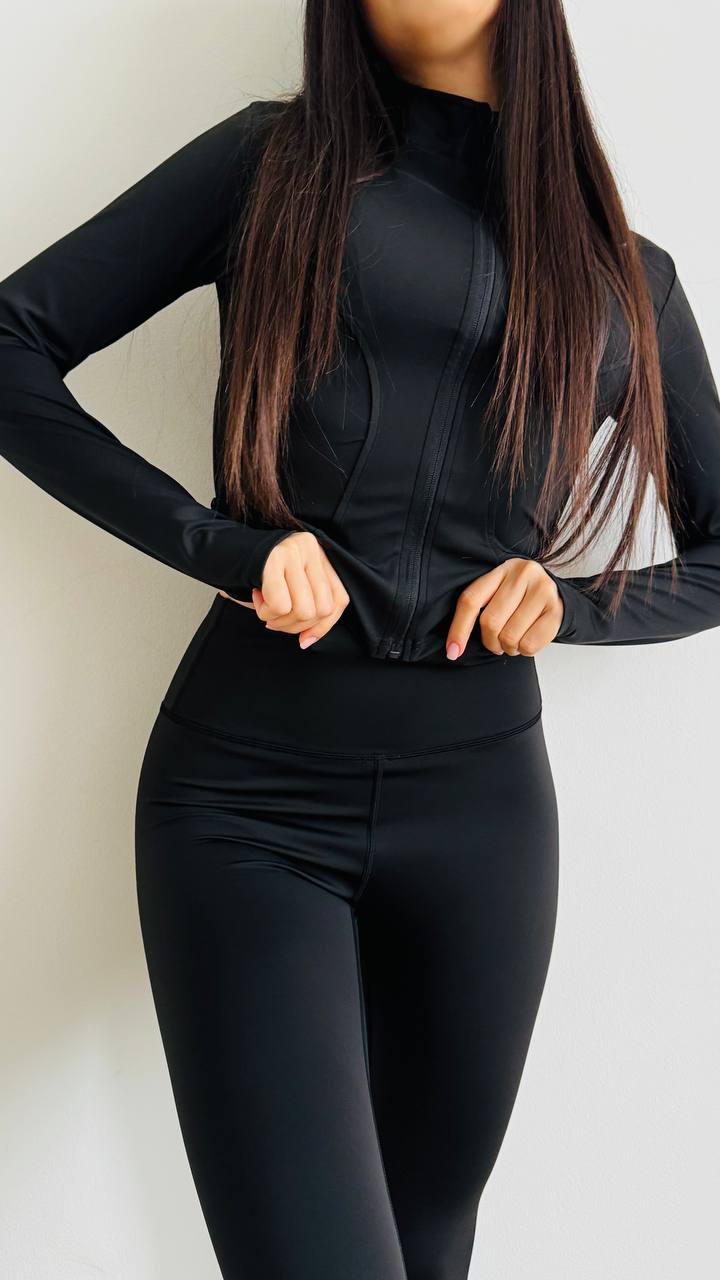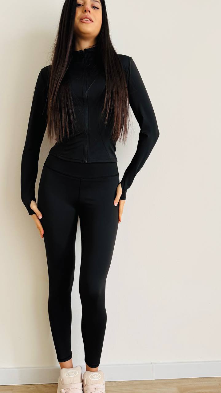 Coordinato realizzato in lycra elasticizzata composto da felpe con zip e leggings super stretch ideale per attività sportive. Disponibile in 2 taglie