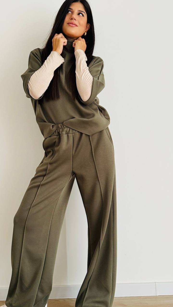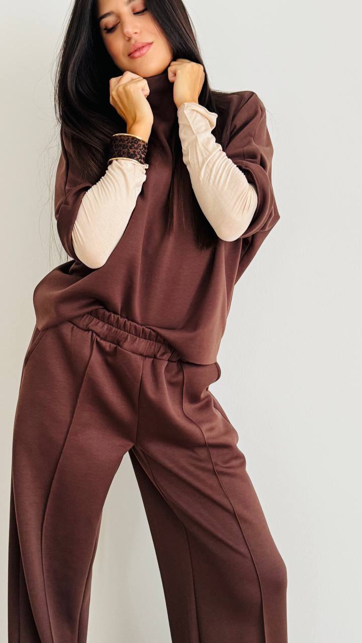 DESCRIZIONE Coordinato composto da maglia con collo ad imbuto e pantalone dritto con coulisse elasticizzata Linee dritte e morbide – Vestibilità slim TAGLIA unica consigliata fino alla 46 Materiale: Scuba – Made in Italy