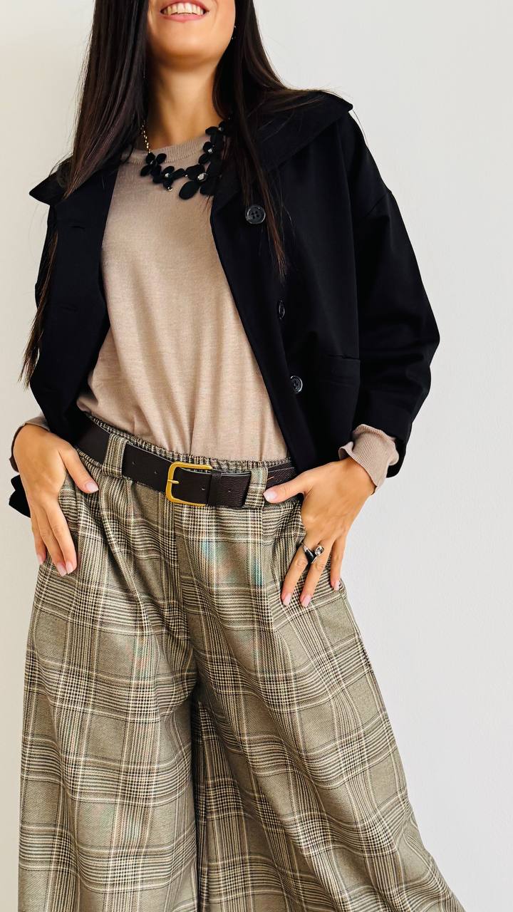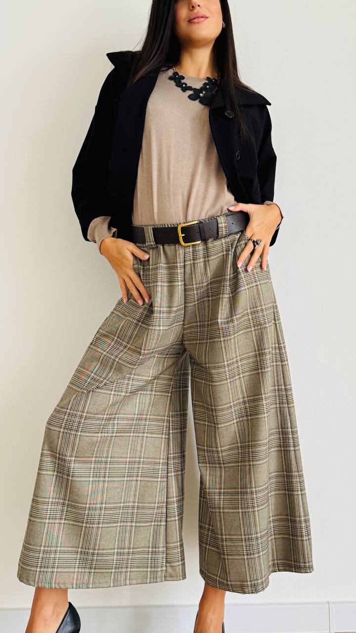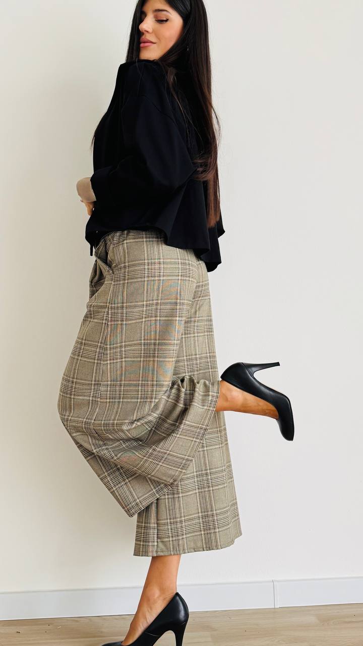 DESCRIZIONE – Pantalone Gaucho in fantasi Principe di Galles – Linee svasate e coulisse in vita – Vestibilità regolare – TAGLIA unica consigliata fino alla 46 – Materiale: Misto viscosa e pl – Made in Italy