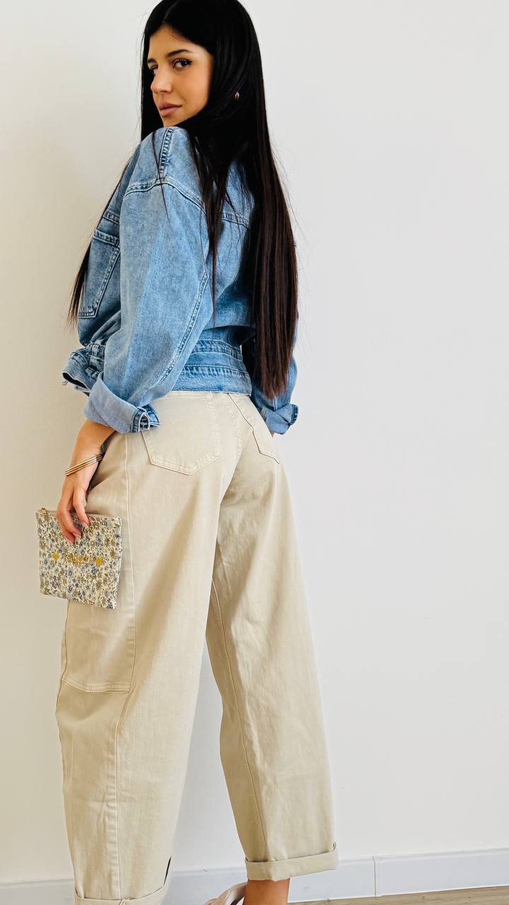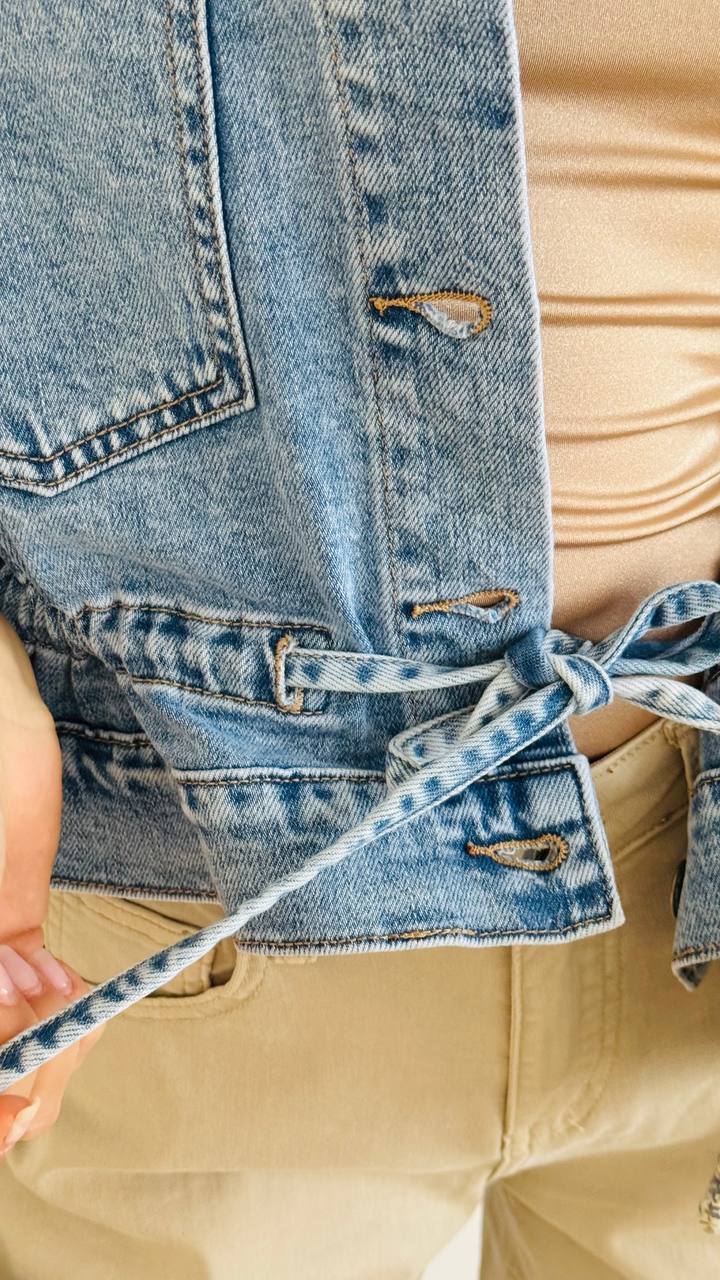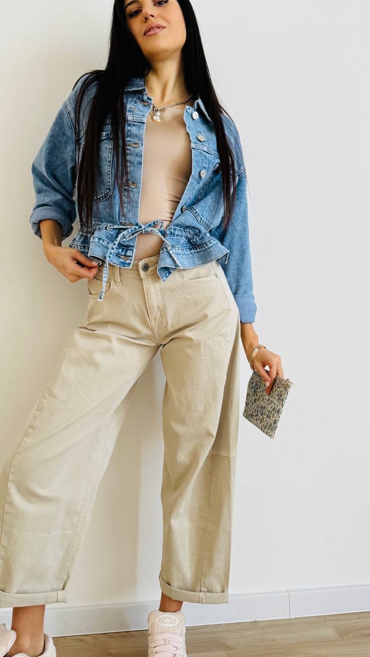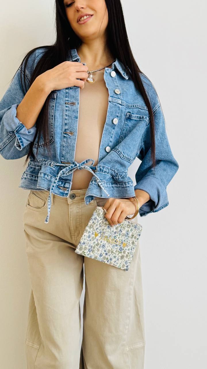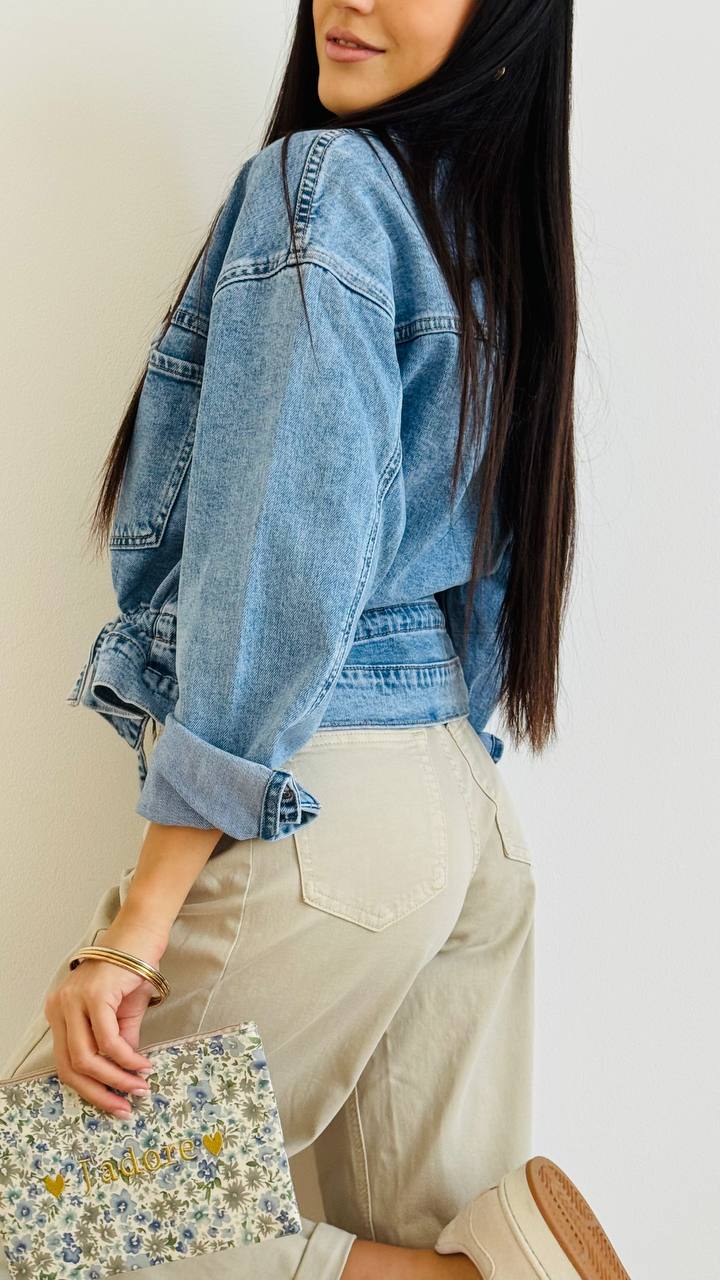 Giacchino in denim leggermente elasticizzato con chiusura a bottoni e coulisse in vita regolabile. taglia unica consigliata fino alla 46.