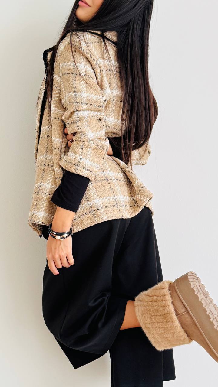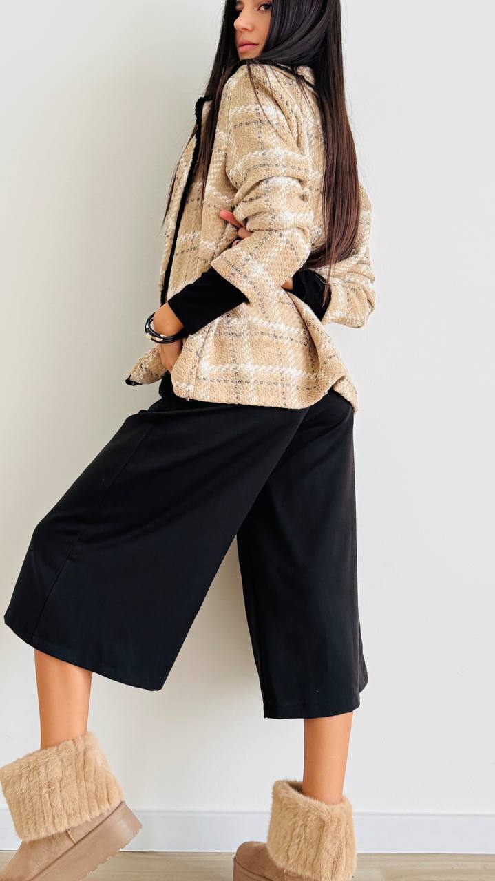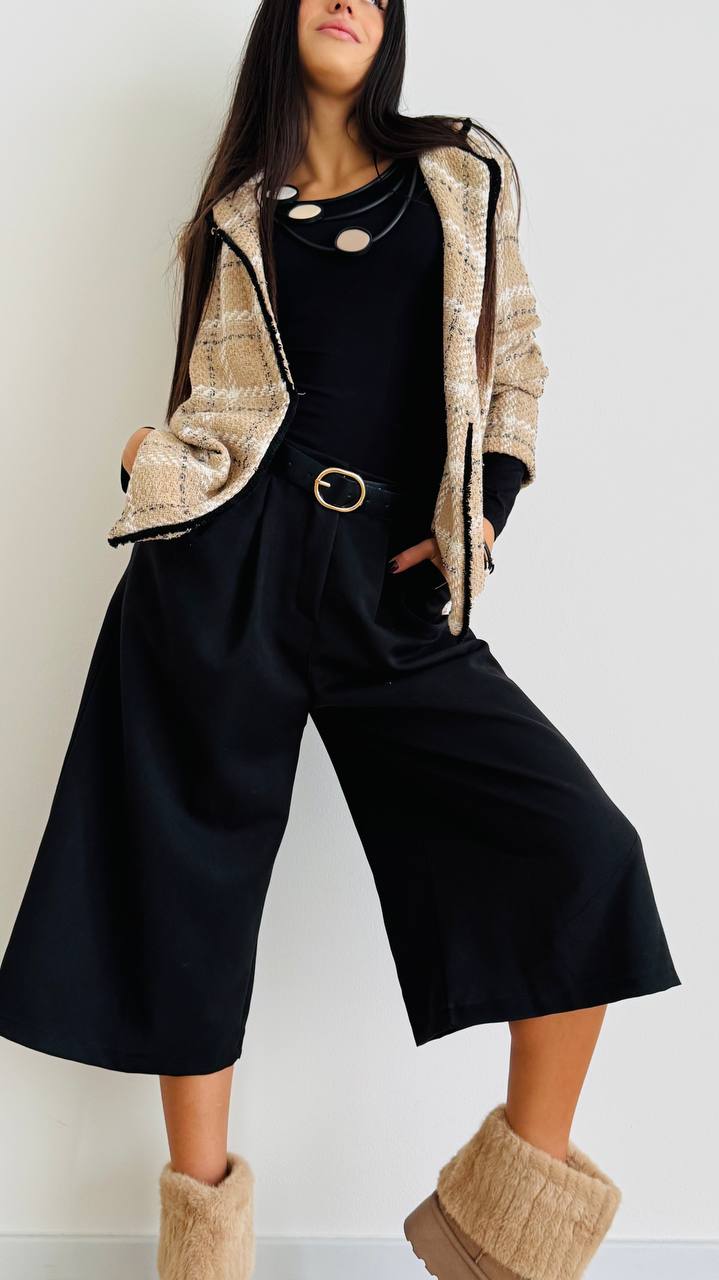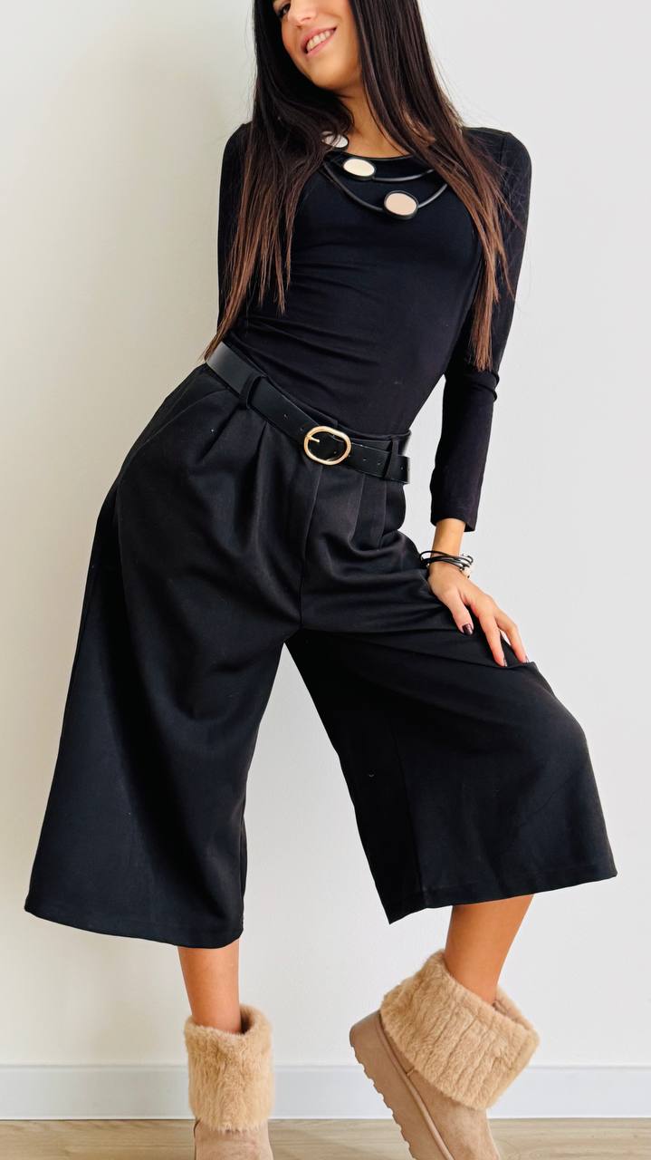 Gonna a pantalone midi realizzata in misto viscosa con tasche a filo e coulisse nella parte posteriore della vita. Made in Italy.
