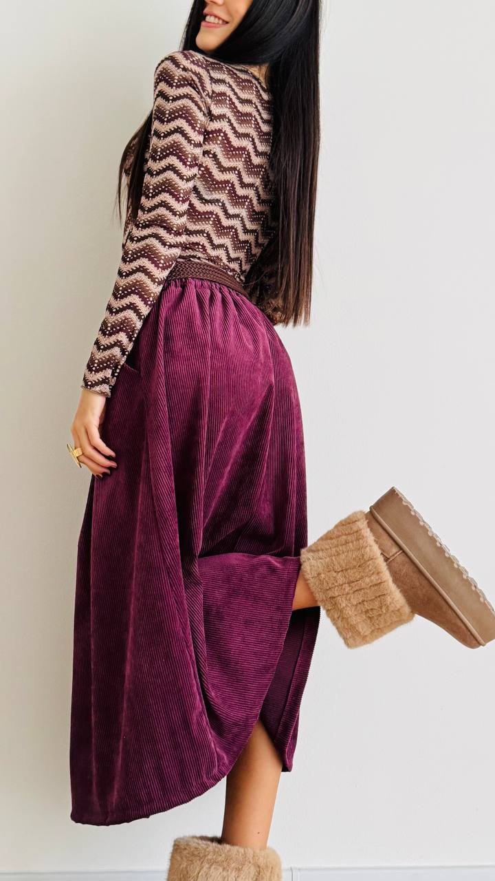 DESCRIZIONE – Gonna midi svasata con coulisse in vita – Tasche a filo e linea svasata ad onda – Vestibilità morbida – TAGLIA UNICA consigliata fino alla 48 – Materiale: velluto a coste – MADE IN ITALY