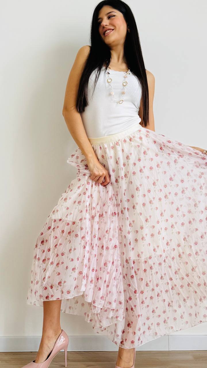 Gonnellone lungo in tulle fantasia foderato con vita elasticizzata. Taglia unica consigliata fino alla 46.