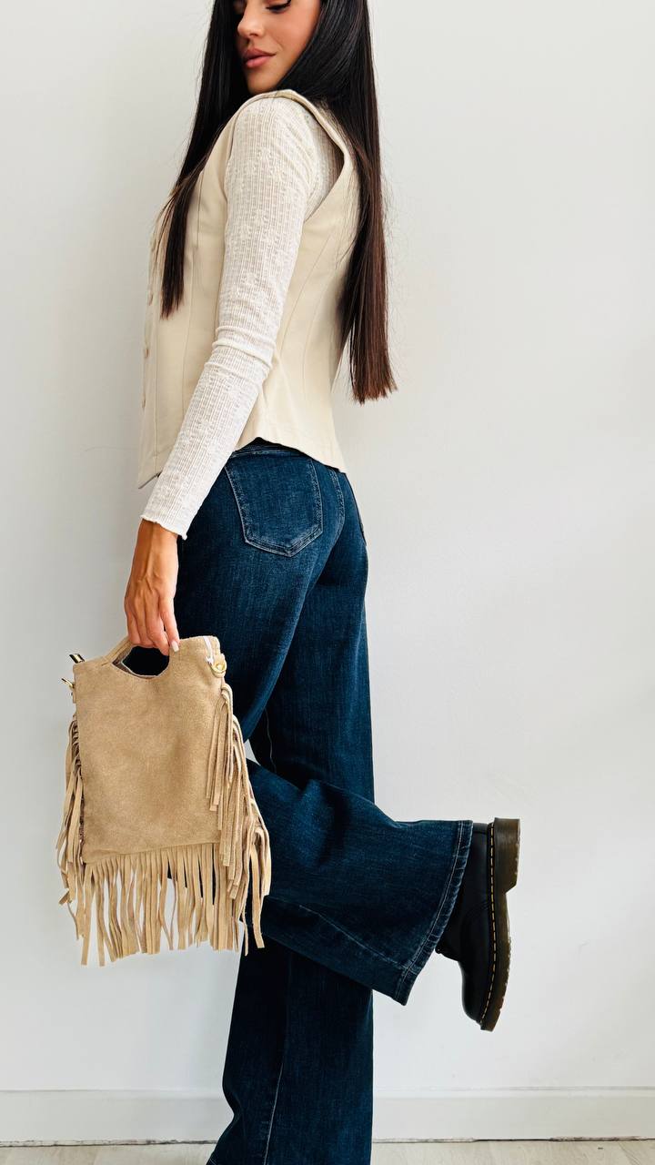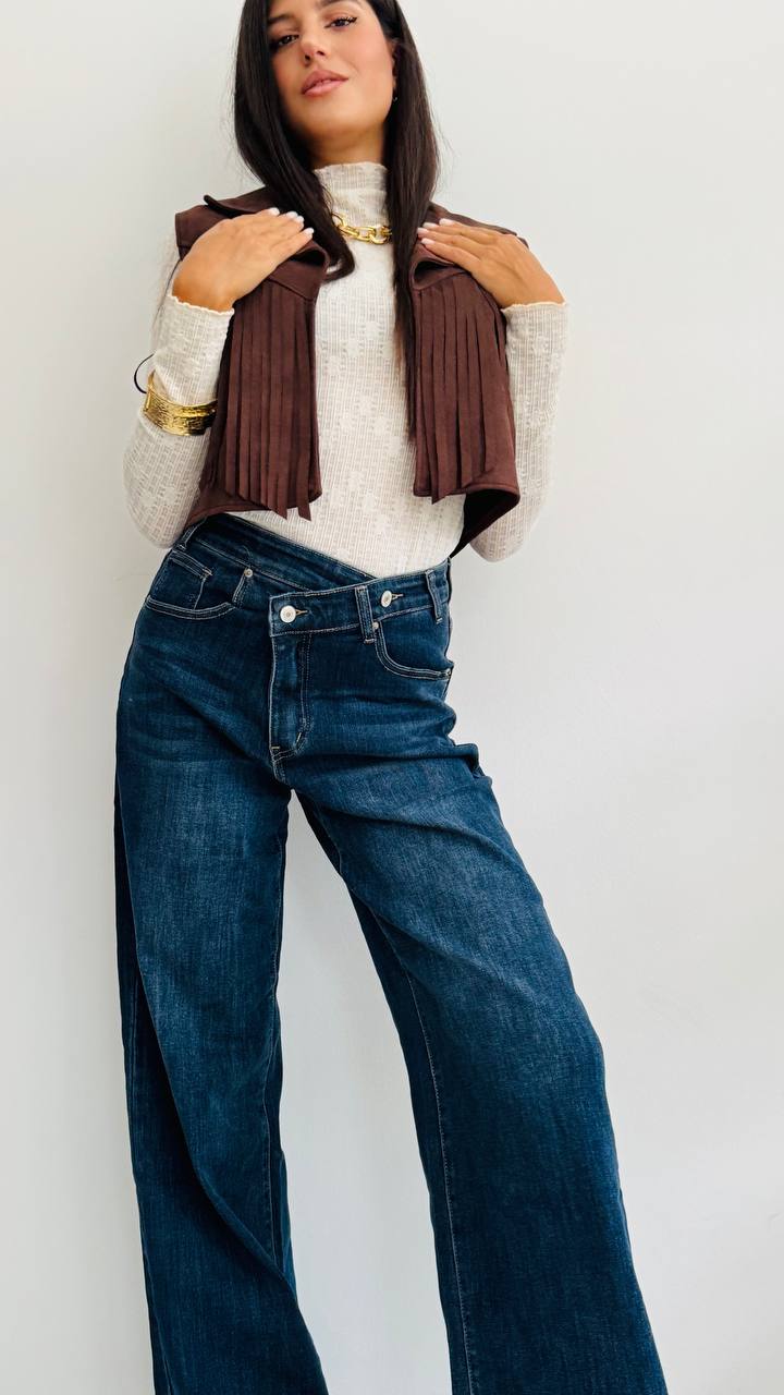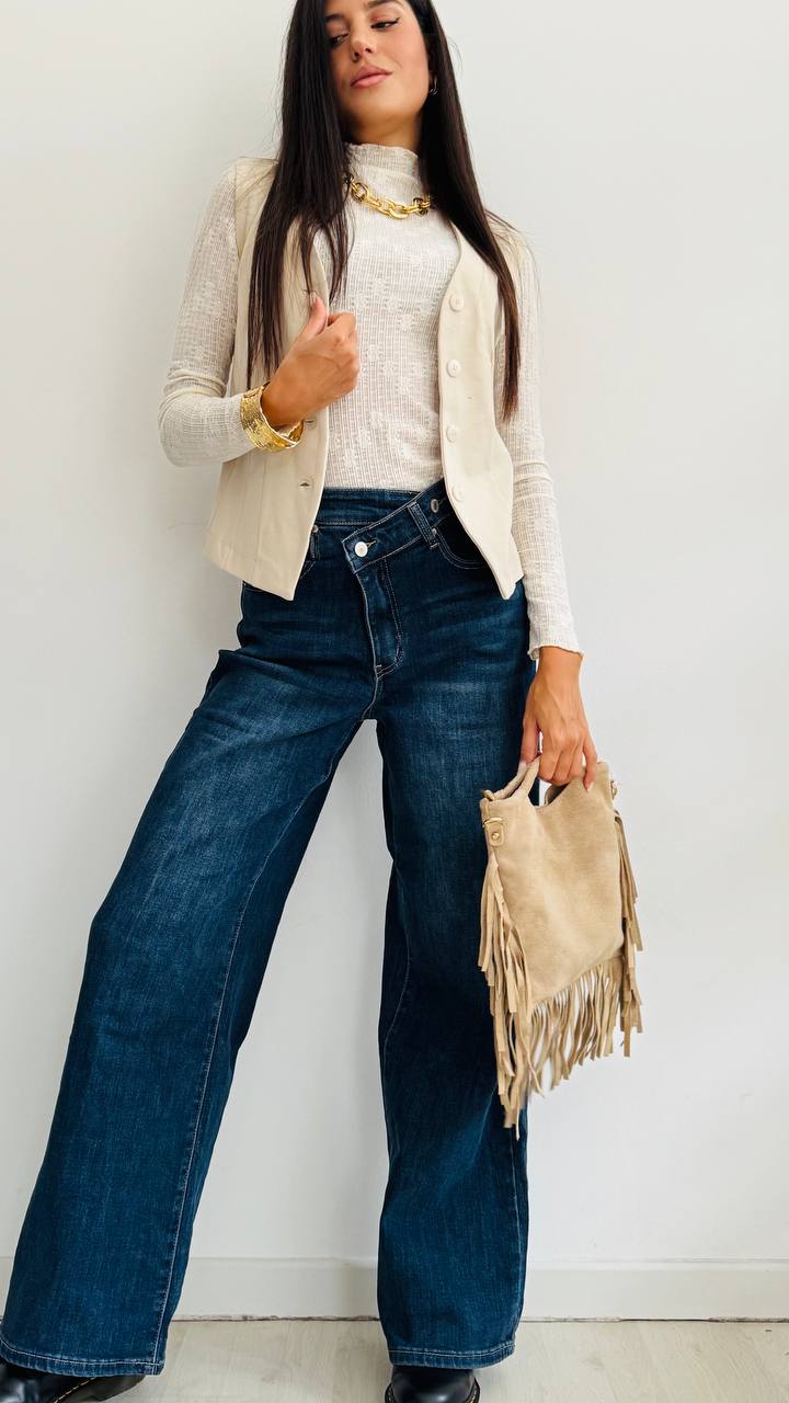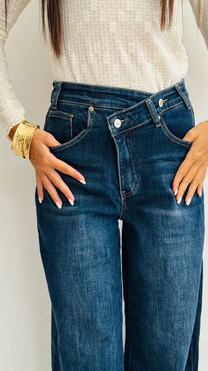 DESCRIZIONE – Jeans a palazzo in lavaggio scuro – Chiusura svasata con bottone – Vestibilità regolare – TAGLIA: dalla S alla L – Materiale: denim leggermente elasticizzato