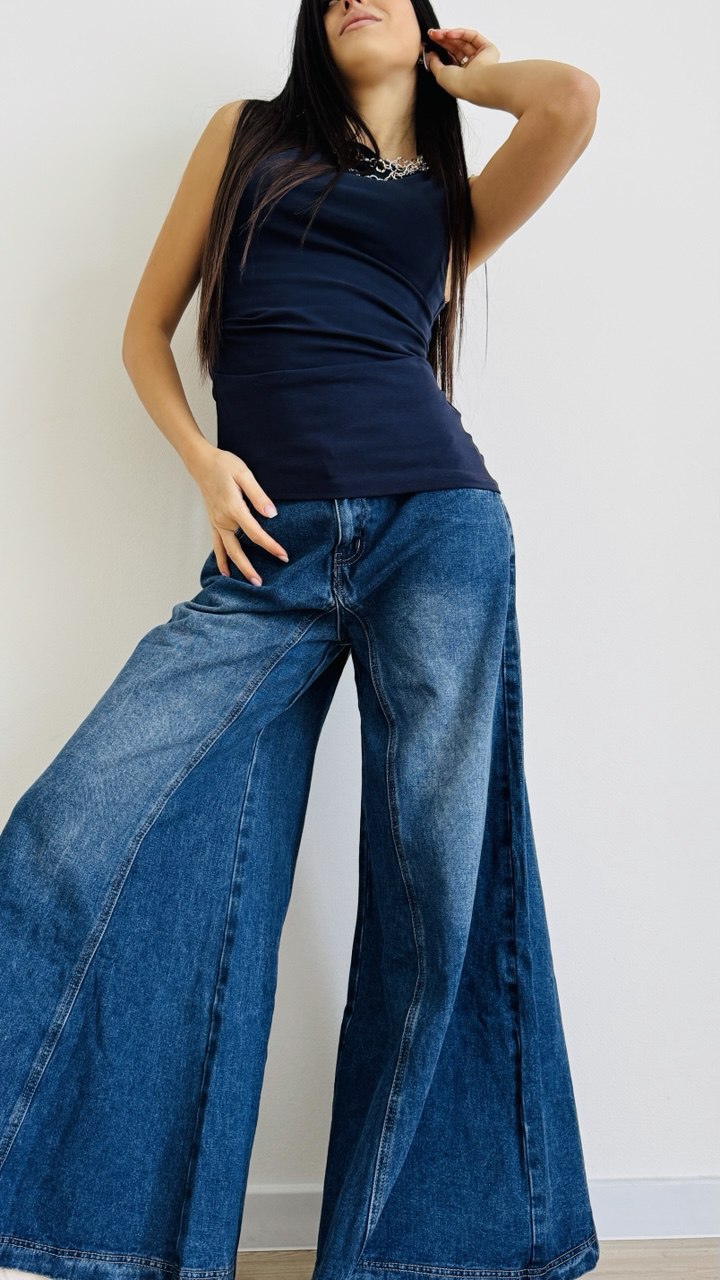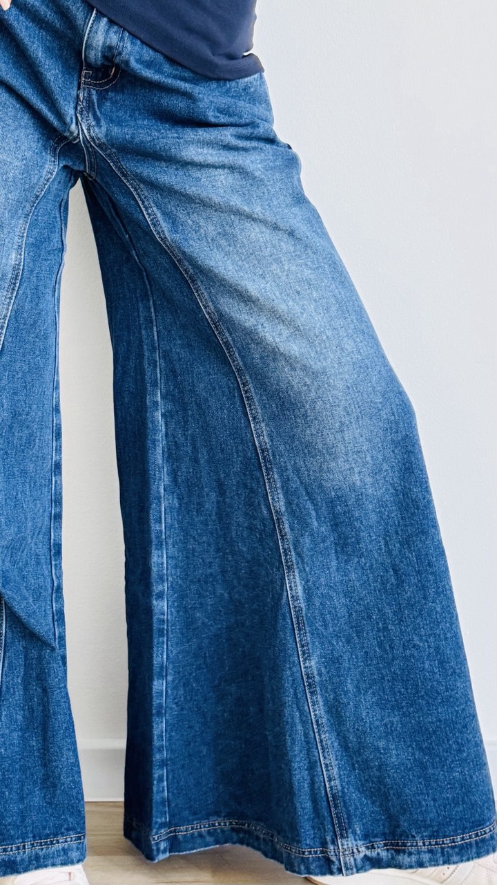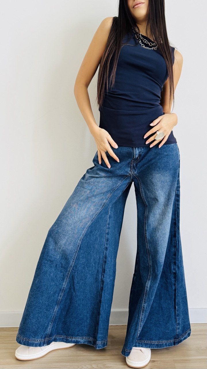 Jeans a fondo molto svasato con taglio ad A realizzato in denim medio scuro.