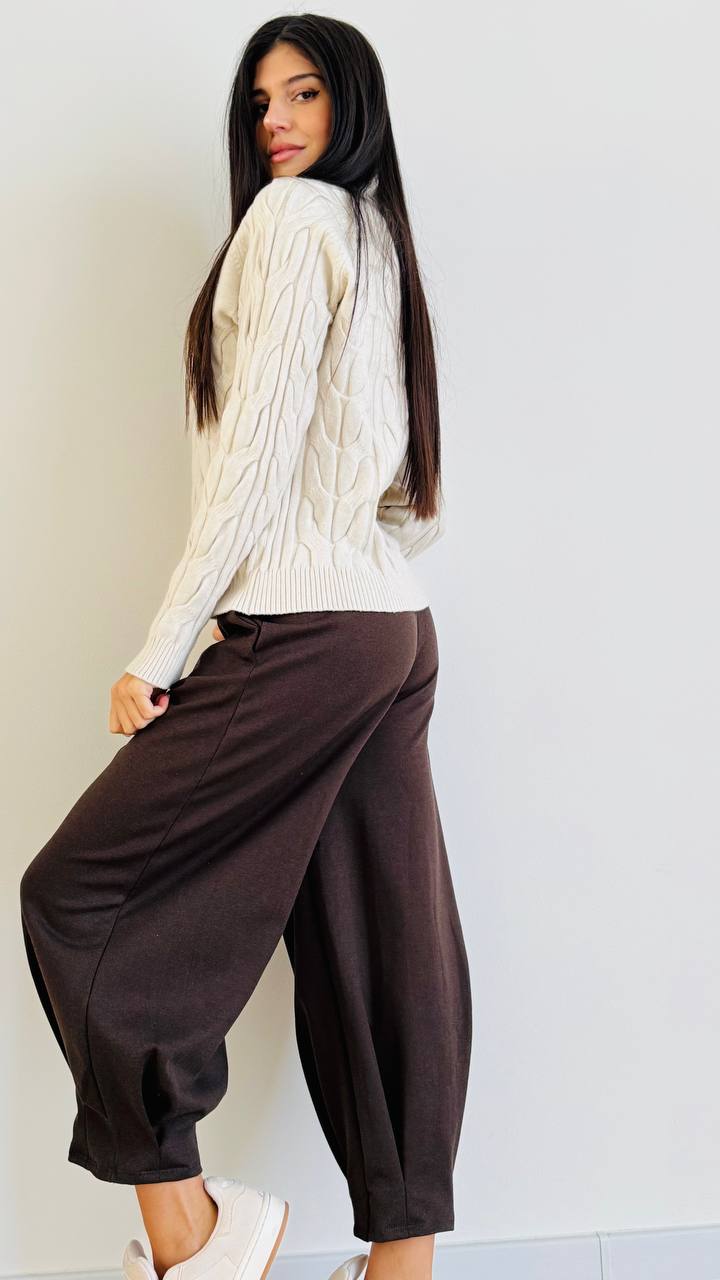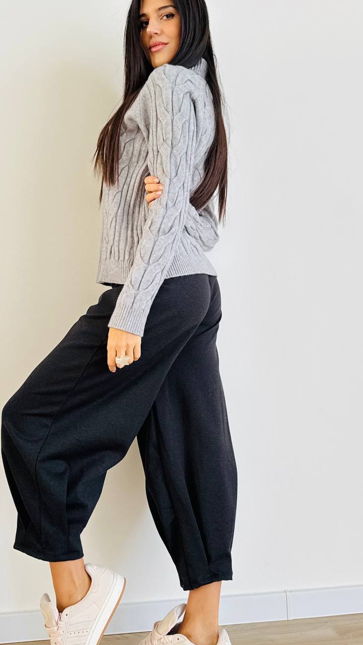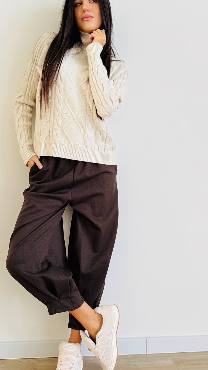 Lupetto realizzato in misto viscosa con lavorazione a trecce e rombi. Taglia unica consigliata fino alla 46