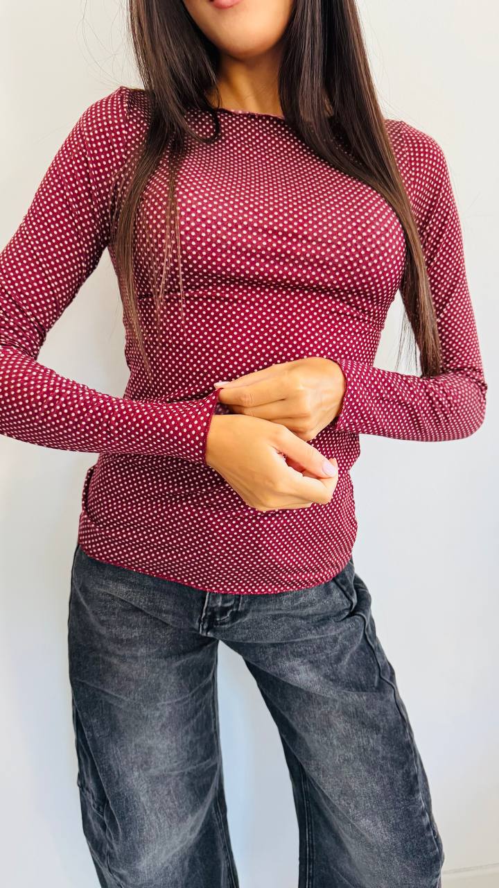 DESCRIZIONE Maglia manica lunga in fantasia Linee asciutte, ideale come sottogliacca – Vestibilità slim TAGLIA unica consigliata fino alla 48 Materiale: Modal e cashmere leggermente elasticizzato – Made in Italy