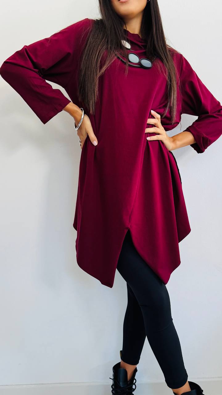 DESCRIZIONE – Maglia manica lunga con collo a vulcano morbido – Linee svasate e asimmetriche e cuciture a vista – Vestibilità morbida e svasata – TAGLIA UNICA consigliata fino alla 48 – Materiale: misto viscosa – MADE IN ITALY