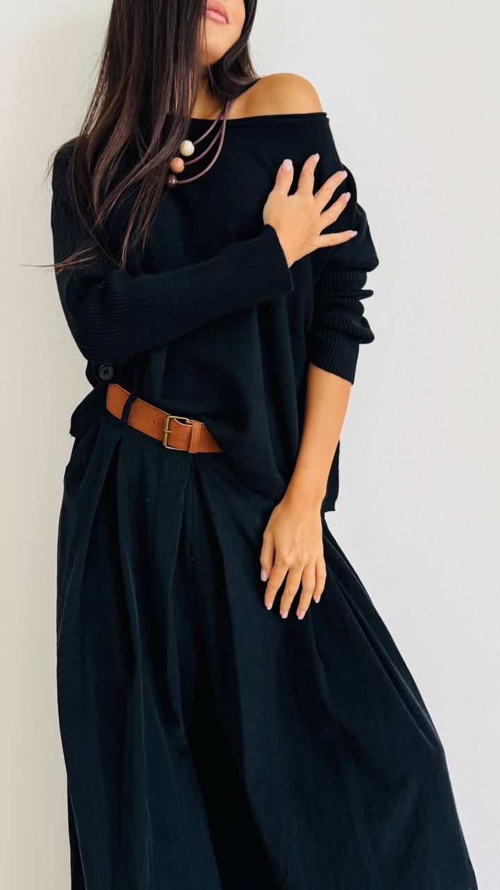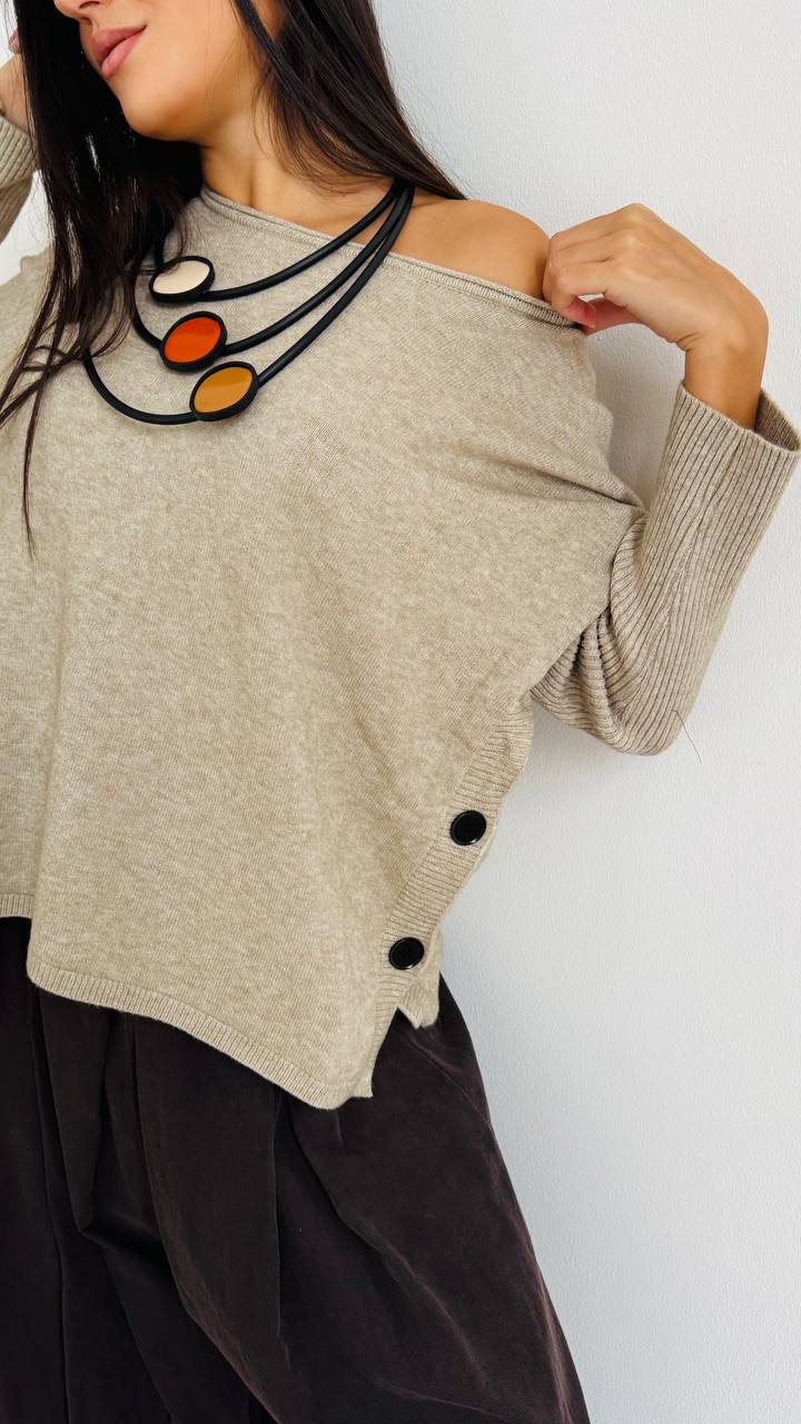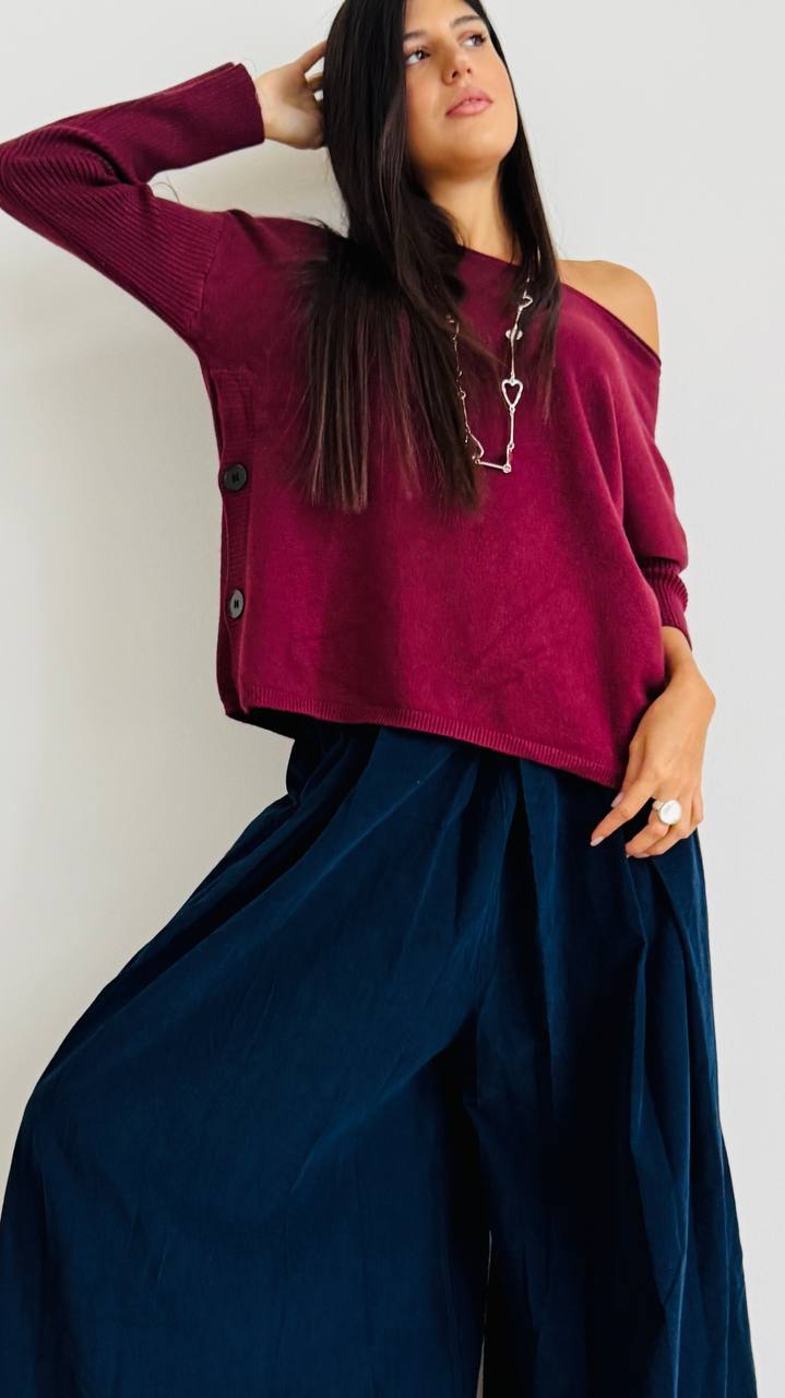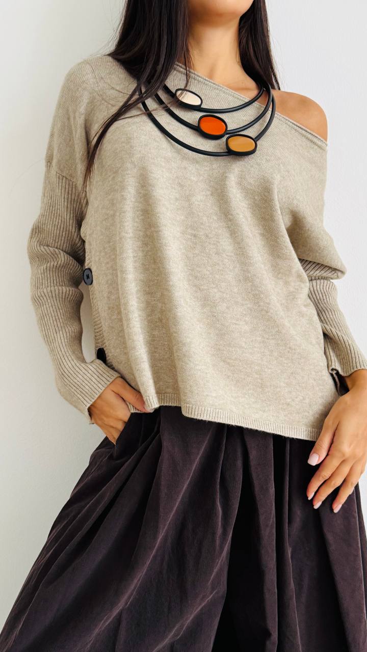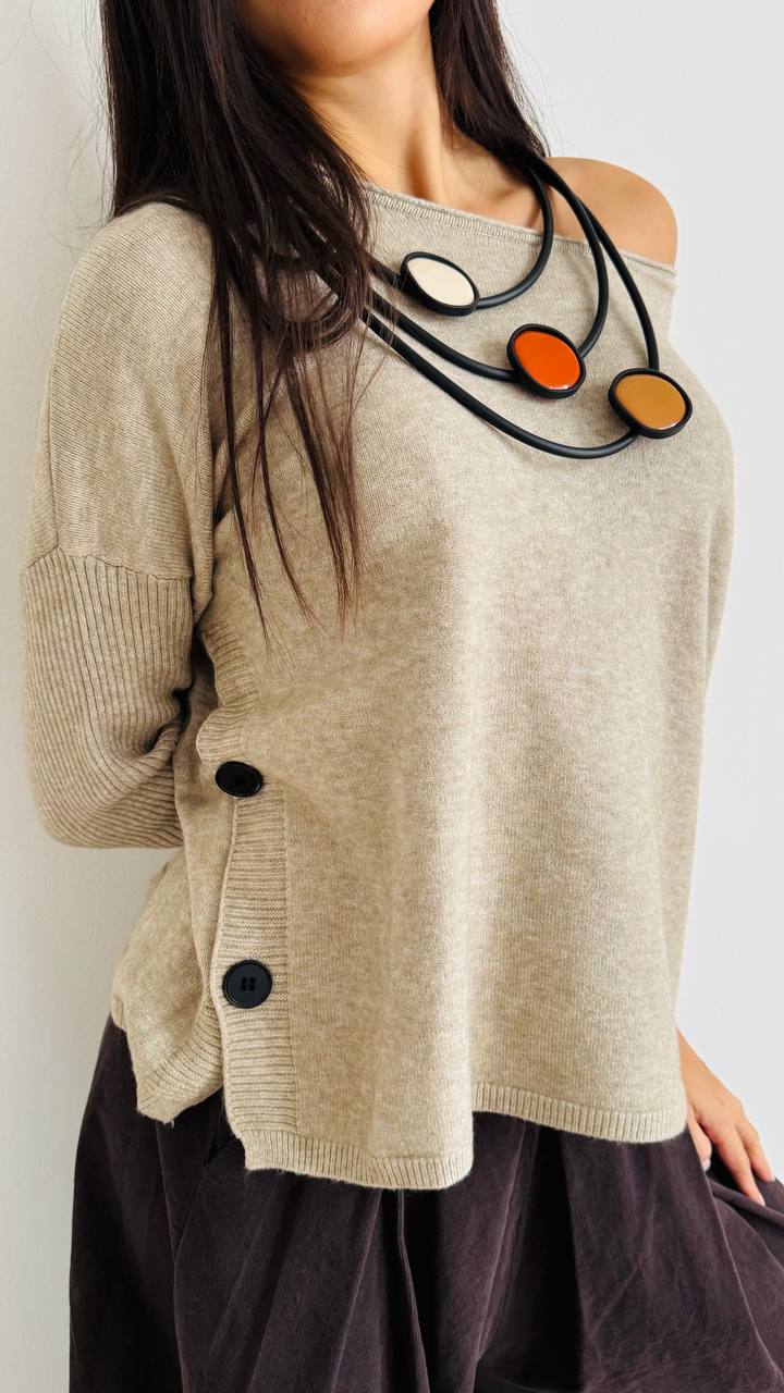 DESCRIZIONE Maglioncino con bottoncini laterali Linee morbide – Vestibilità regolare TAGLIA unica consigliata fino alla 46/48 Materiale: Misto viscosa e pl