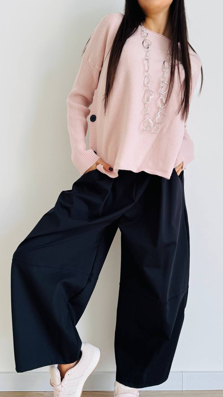 DESCRIZIONE Maglioncino con bottoncini laterali Linee morbide – Vestibilità regolare TAGLIA unica consigliata fino alla 46/48 Materiale: Misto viscosa e pl