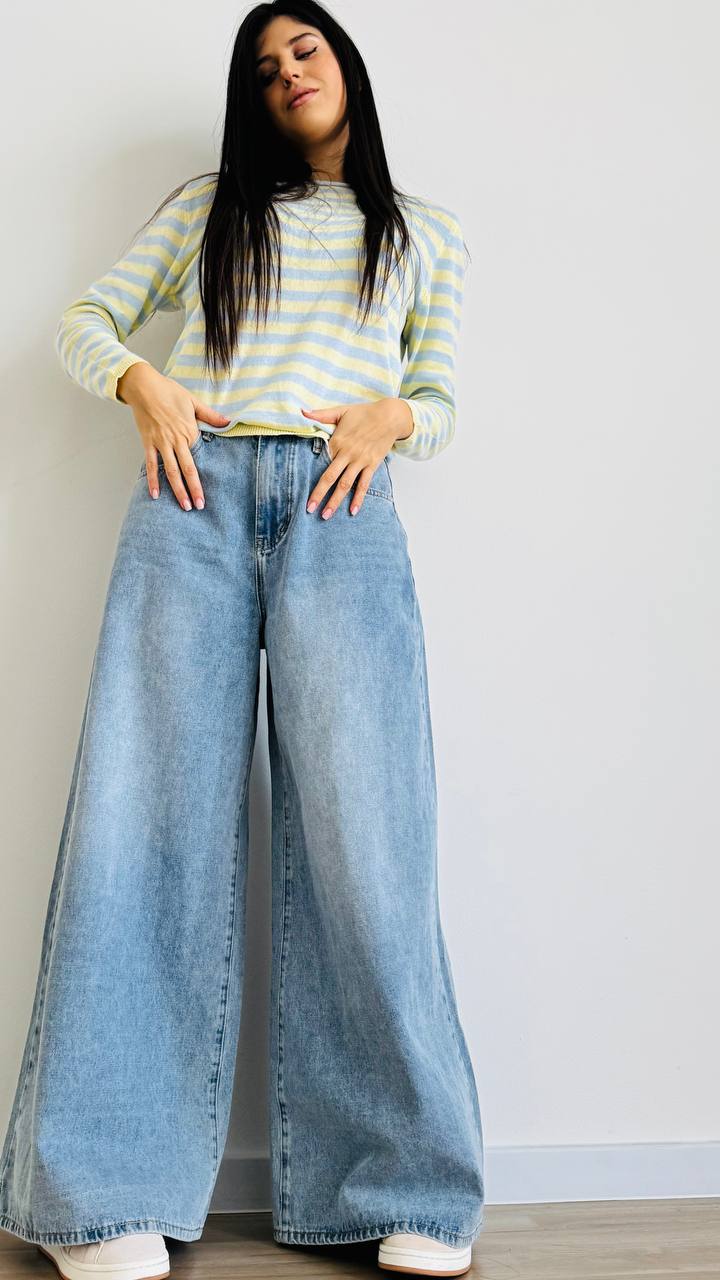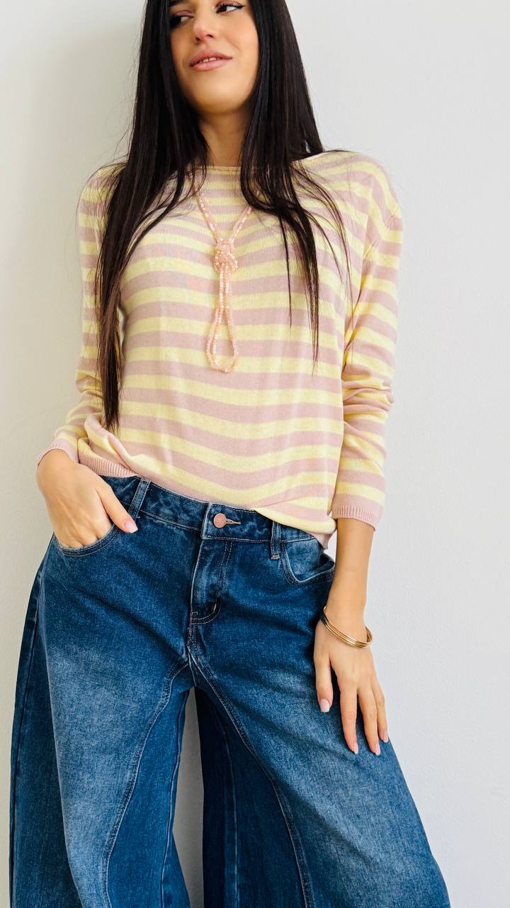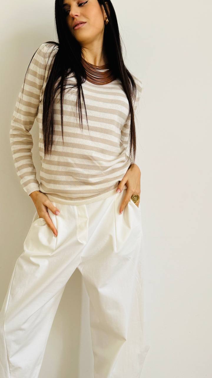 Maglioncino con scollo a barchetta in fantasia rigata realizzato in puro filo di cotone. Taglia unica consigliata fino alla 48. Made in Italy.