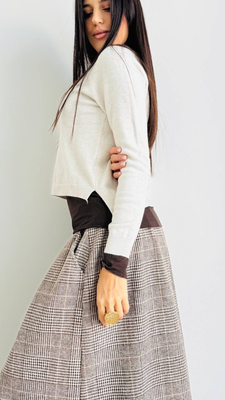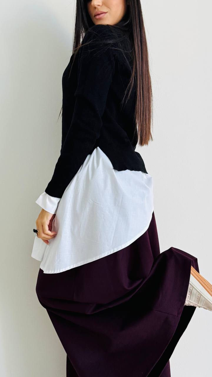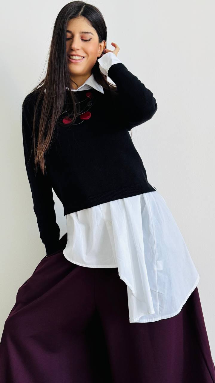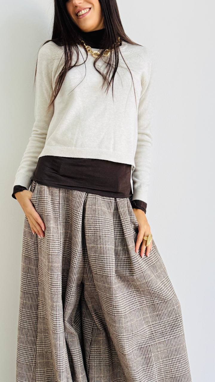 Maglioncino girocollo dalle linee corte realizzato in misto viscosa ideale da indossare su maglie o camicie lunghe. Taglia unica cosnigliata fino alla 44/46.