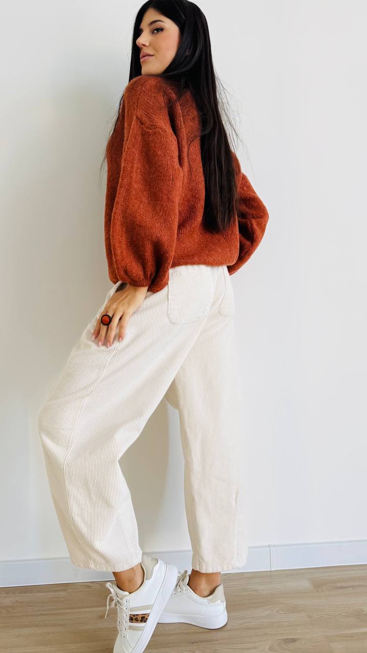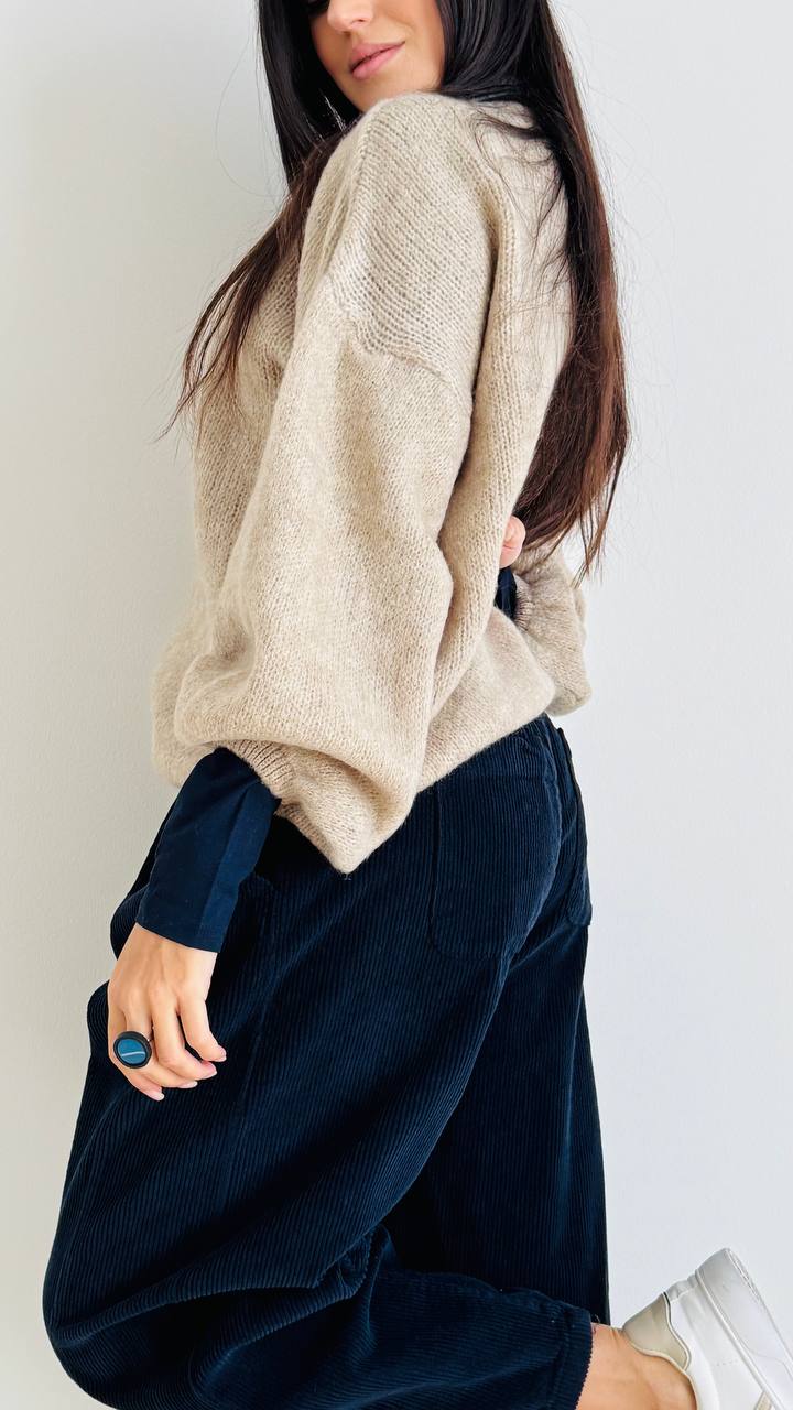 Maglione scollo tondo con manica a sbuffo dalle linee morbide e arrotondate. Taglia unica consigliata fino alla 48. Made in Italy