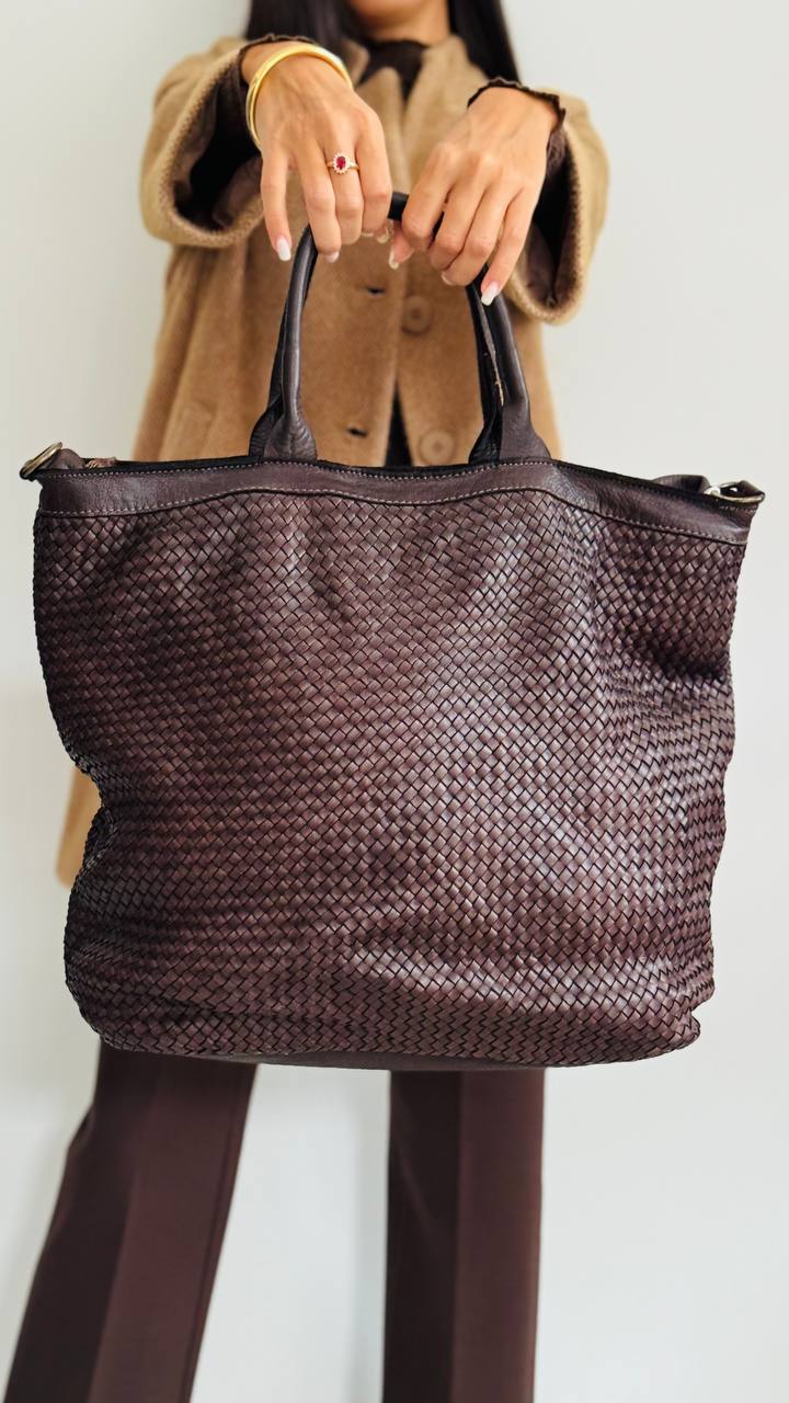 Maxi borsa realizzata in pelle intrecciata con chiusura a cerniera e doppio manico. Tracolla in pelle inclusa. Made in Italy.