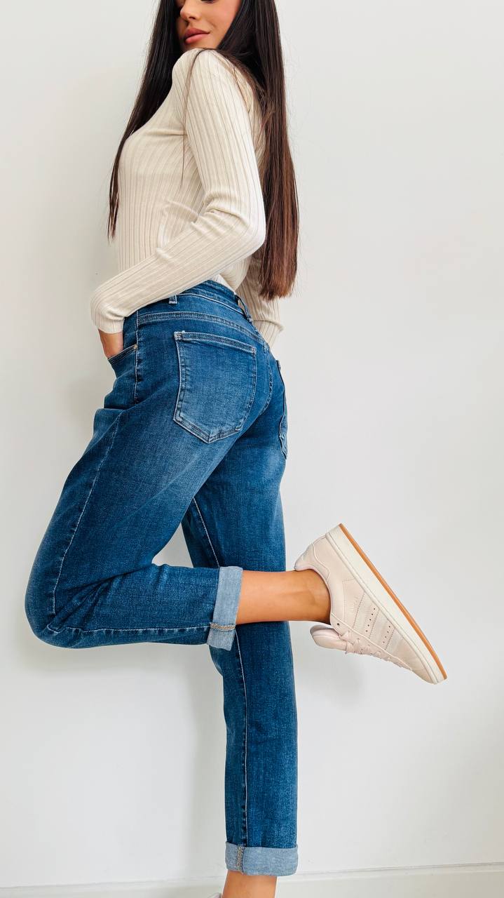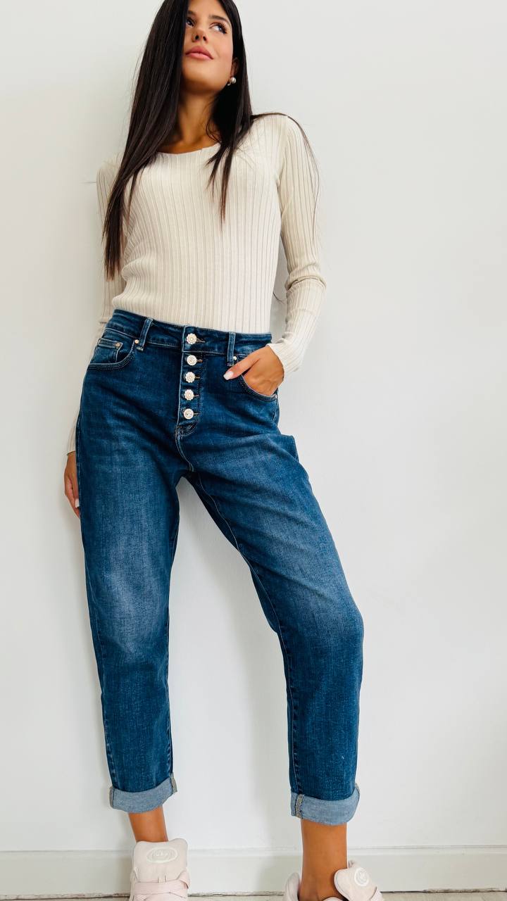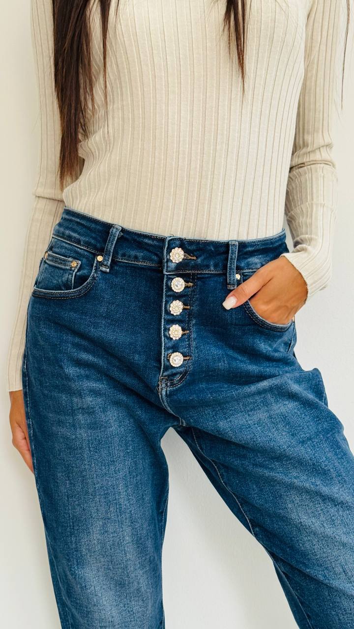 DESCRIZIONE – Jeans Mom Fit realizzato – Bottoni gioiello e tasche classiche – Vestibilità comoda mom fit – TAGLIA dalla S alla XL – Materiale: cotone denmi leggermente elasticizzato