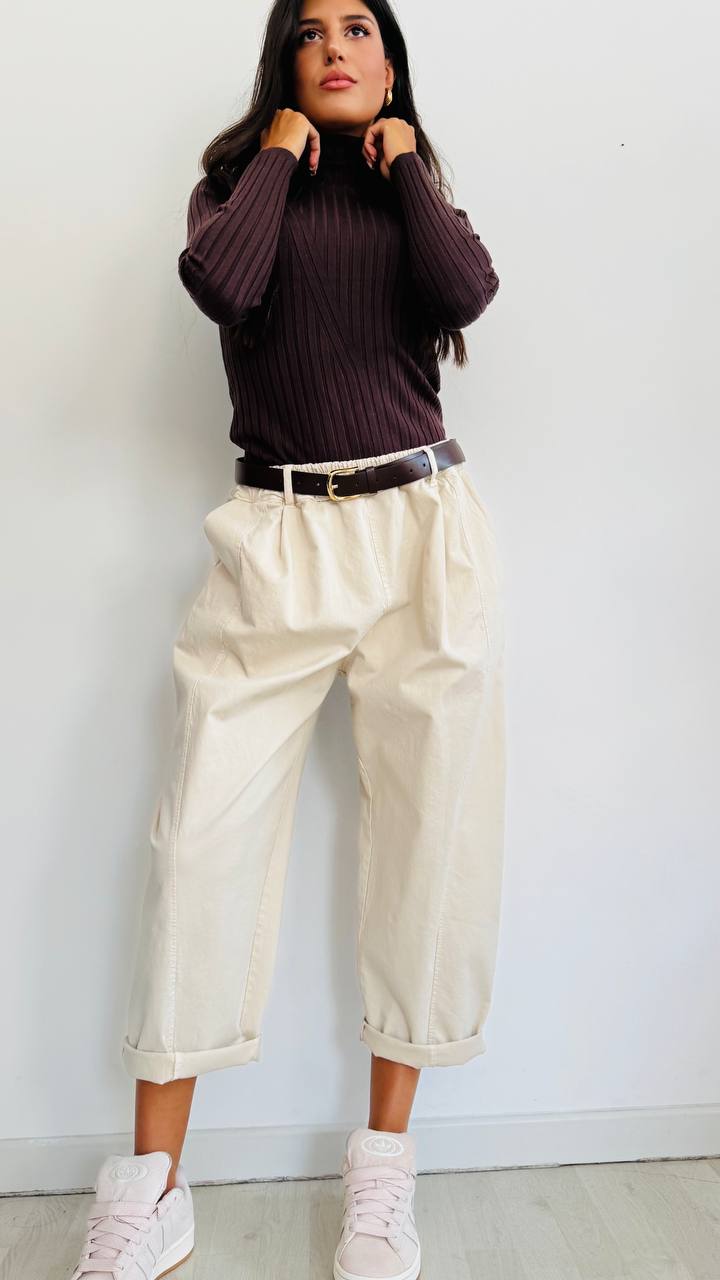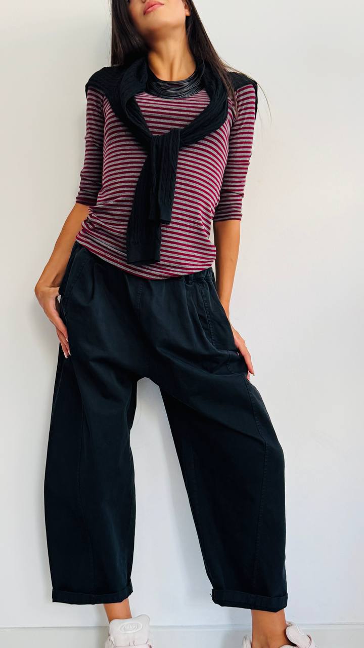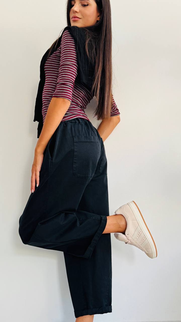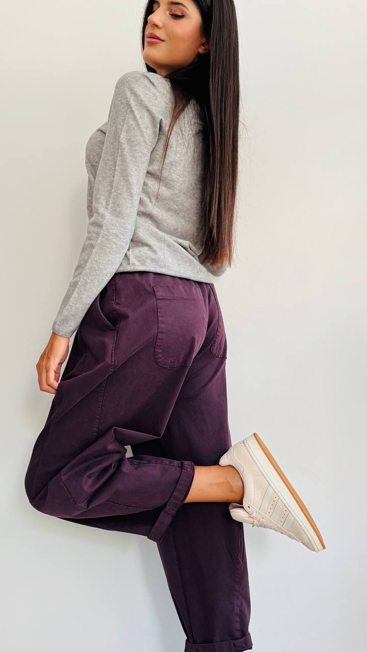 DESCRIZIONE – Pantalone baggy con coulisse in vita – Tasche a filo e linea arrotondata – Vestibilità comoda – TAGLIA UNICA consigliata fino alla 46 – Materiale: cotone autunnale leggermente elasticizzato – MADE IN ITALY