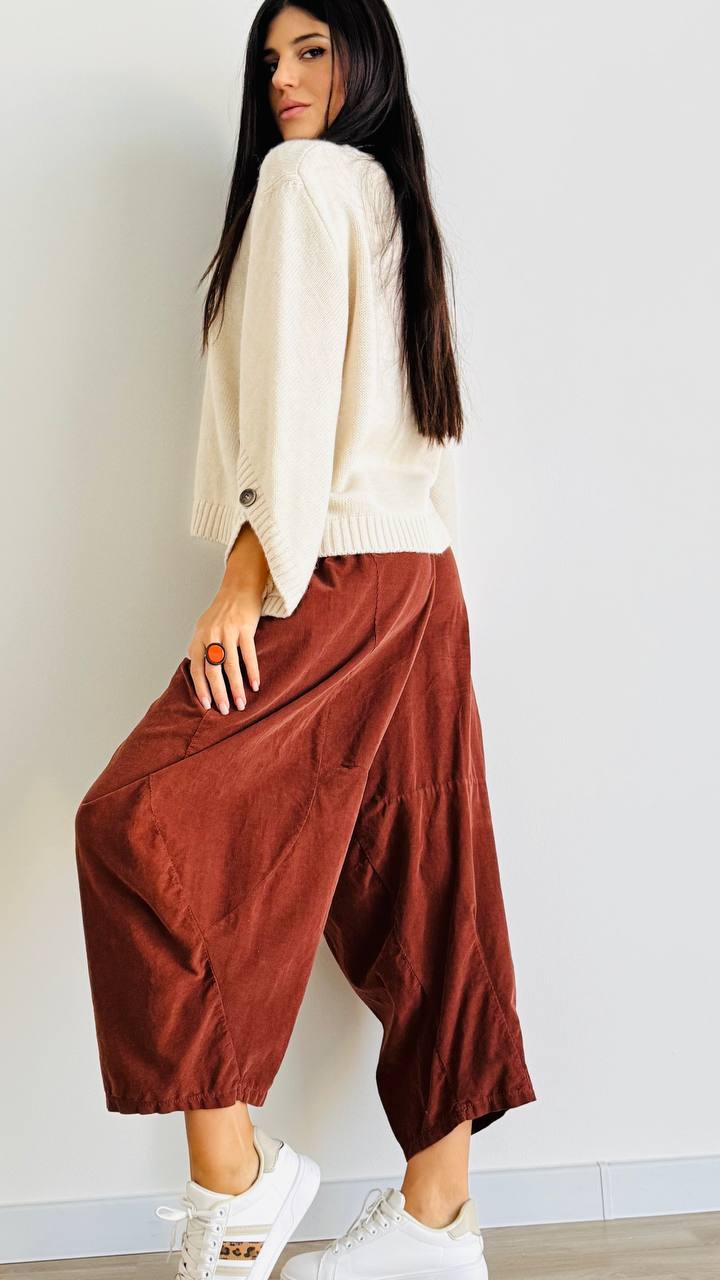 Pantalone dalle linee casual e grintose realizzto in velluto a coste. Taglia unica consigliata fino alla 48. Made in Italy.