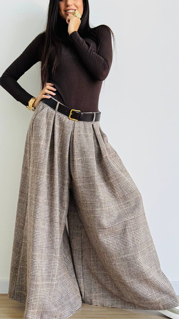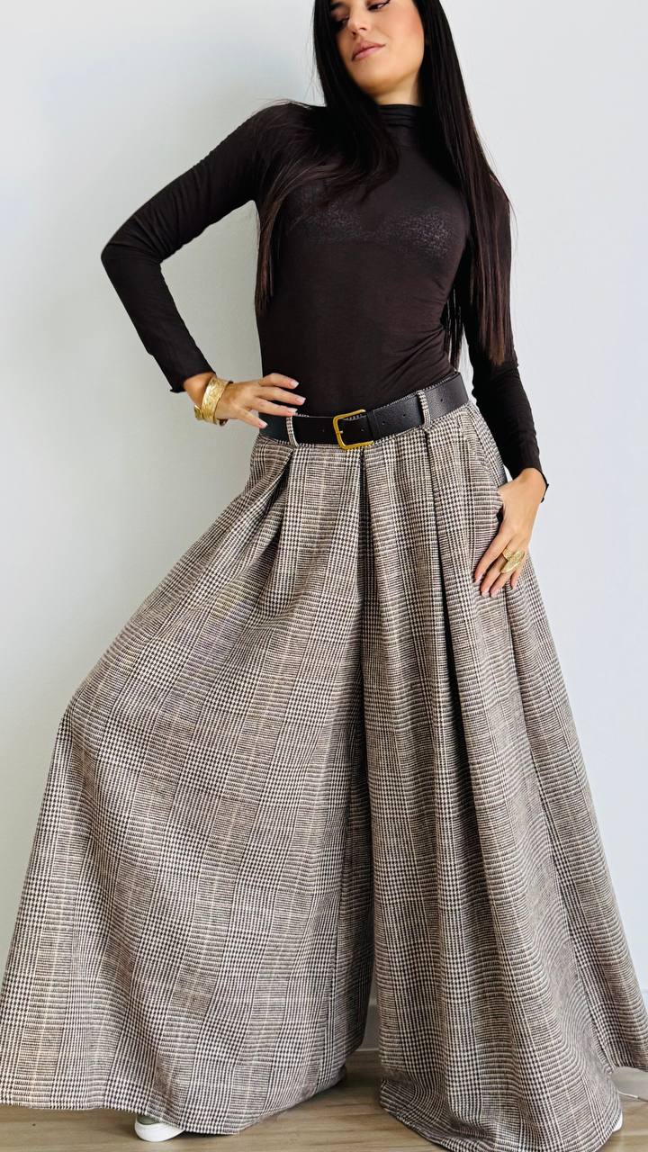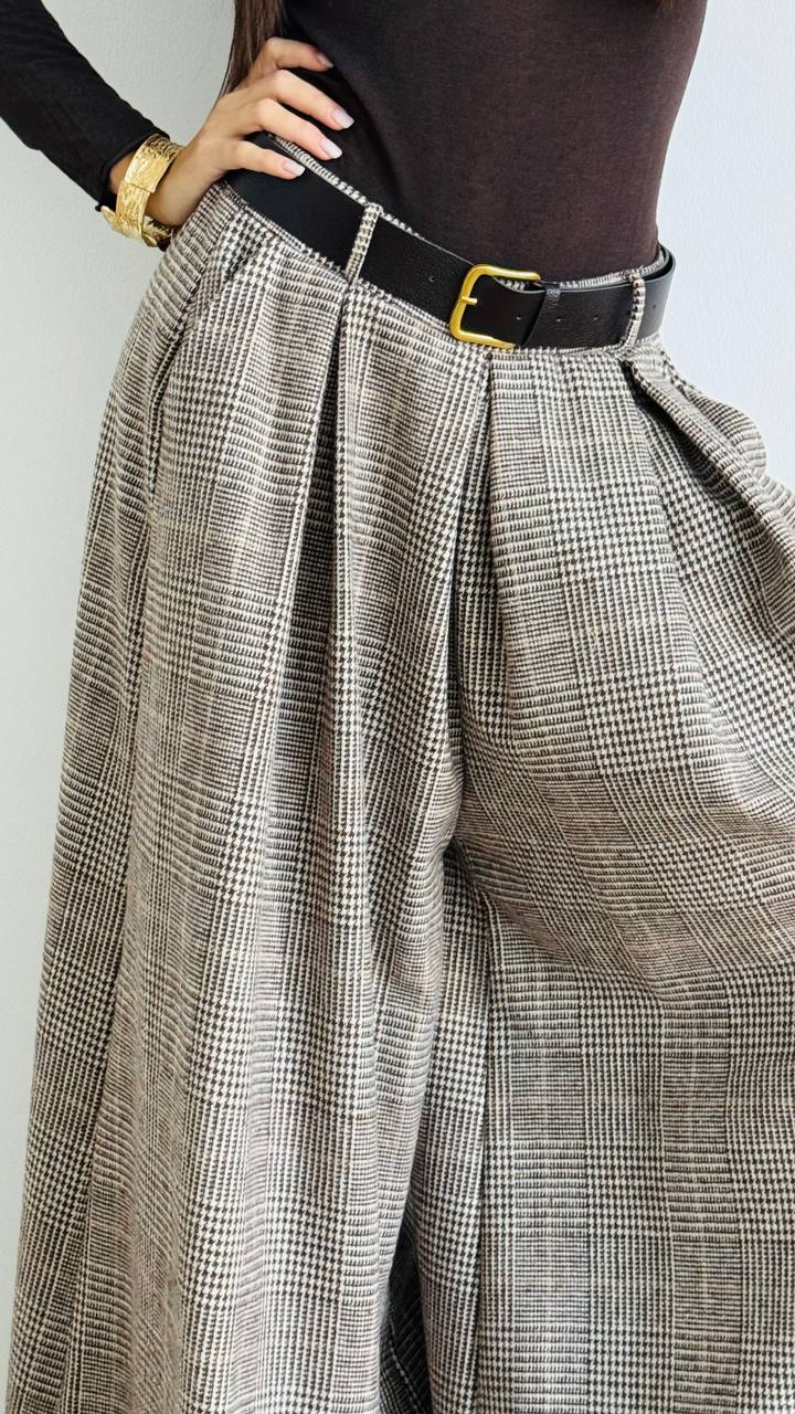 DESCRIZIONE Pantalone svasato in fantasia Pied de poule Linee ampie e svasate – Vestibilità morbida TAGLIA unica consigliata fino alla 48 Materiale: Pl effetto lana – Made in Italy