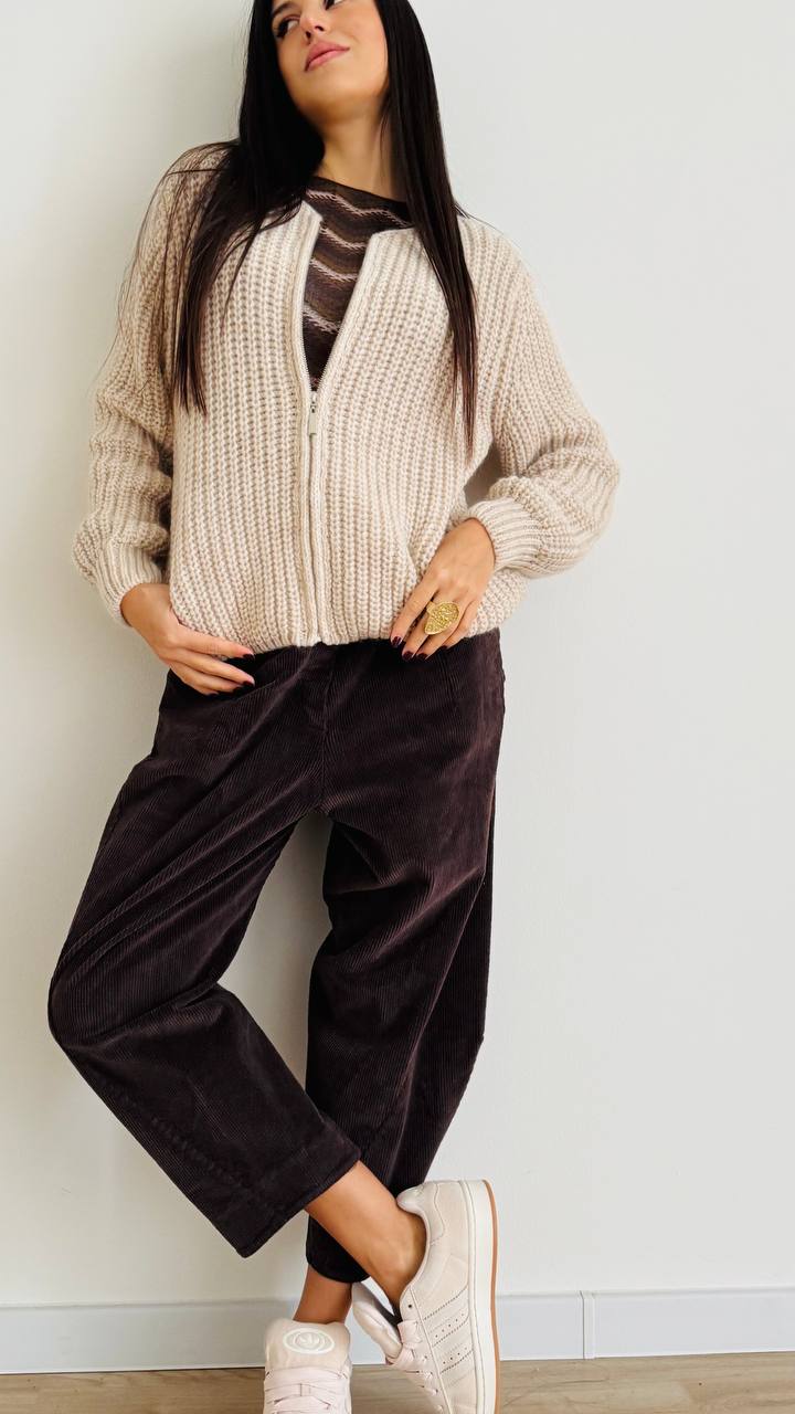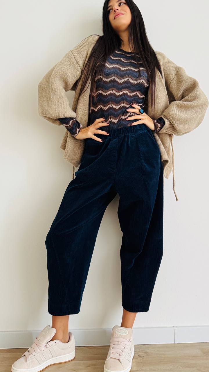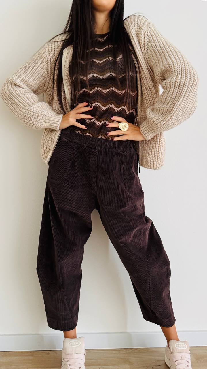 Pantalone ad ovetto con cucitura obliqua realizzato in puro cotone di velluto a costa intermedia, con coulisse in vita. Taglia unica consigliata fino alla 46. Made inn Italy.