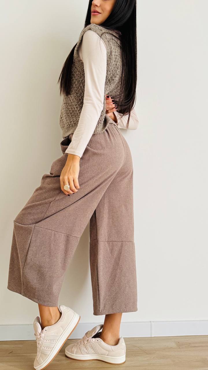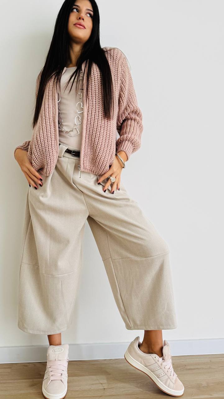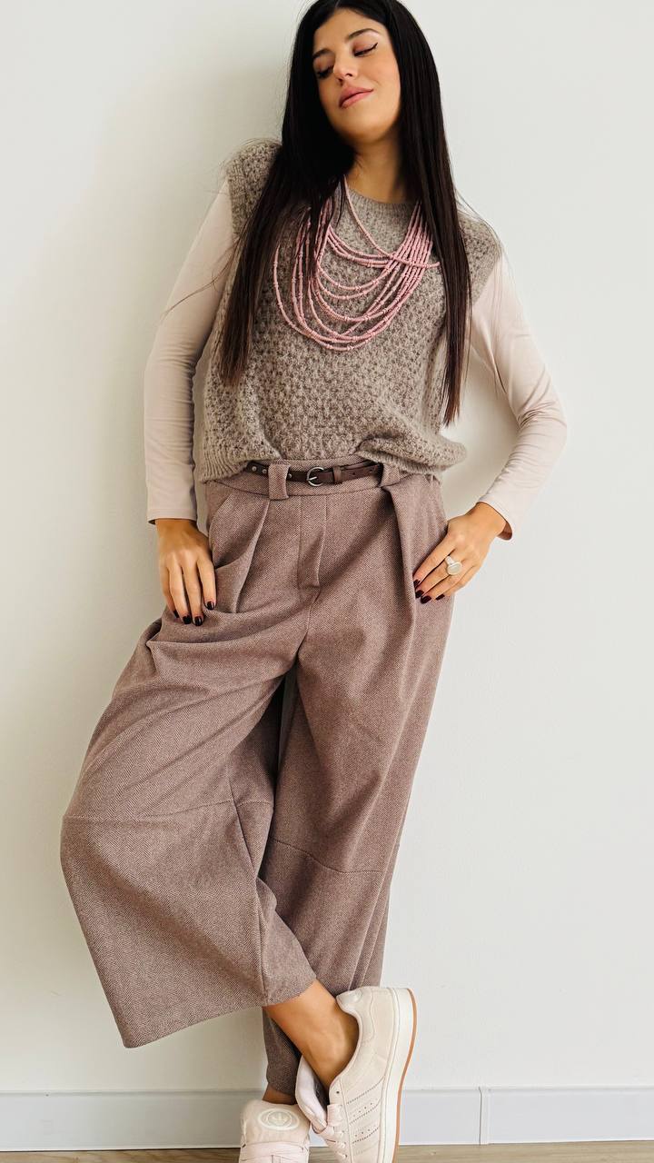 Pantalone taglio ovetto con coulisse in vita in fantadsia spigata effetto lana. Taglia unica consigliata fino alla 46/48. Made in Italy