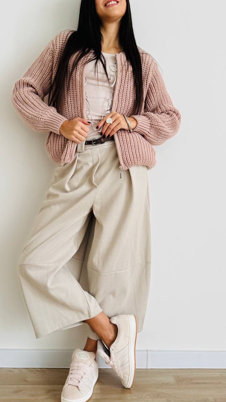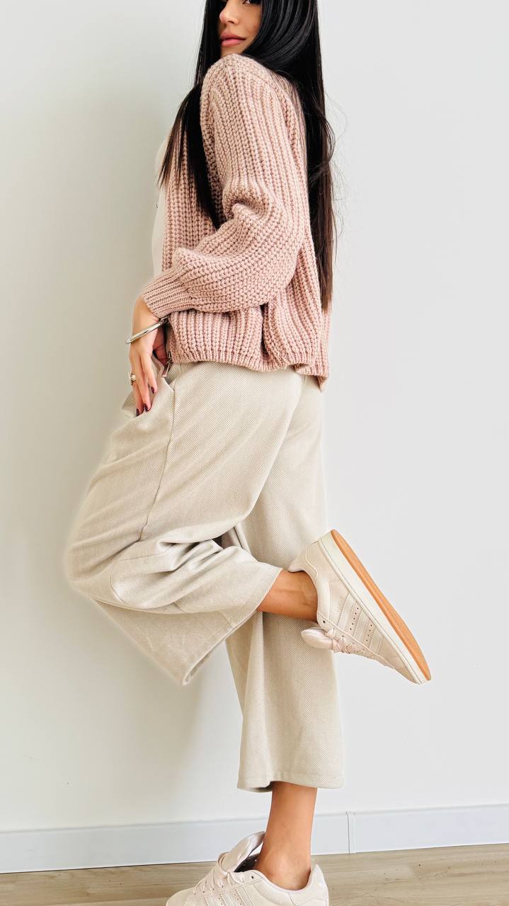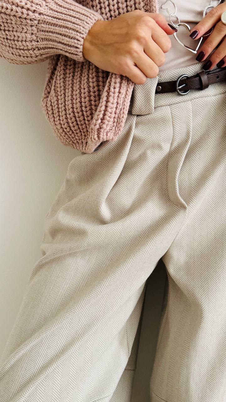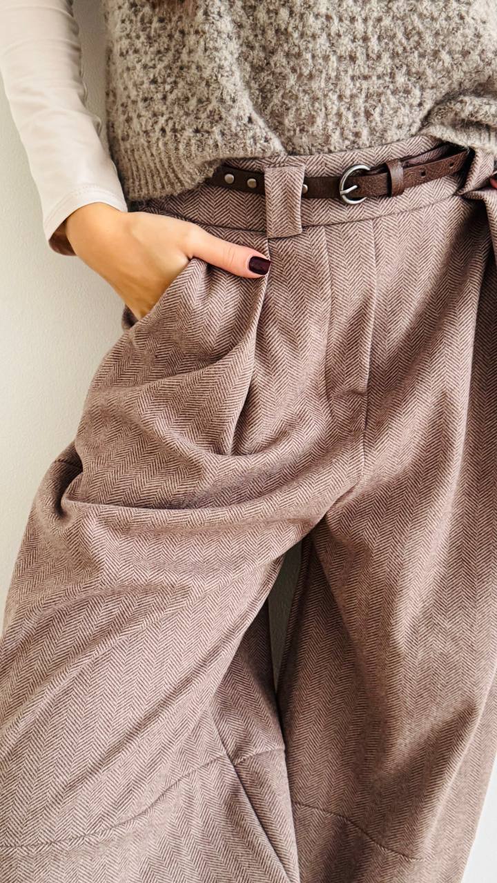 Pantalone taglio ovetto con coulisse in vita in fantadsia spigata effetto lana. Taglia unica consigliata fino alla 46/48. Made in Italy