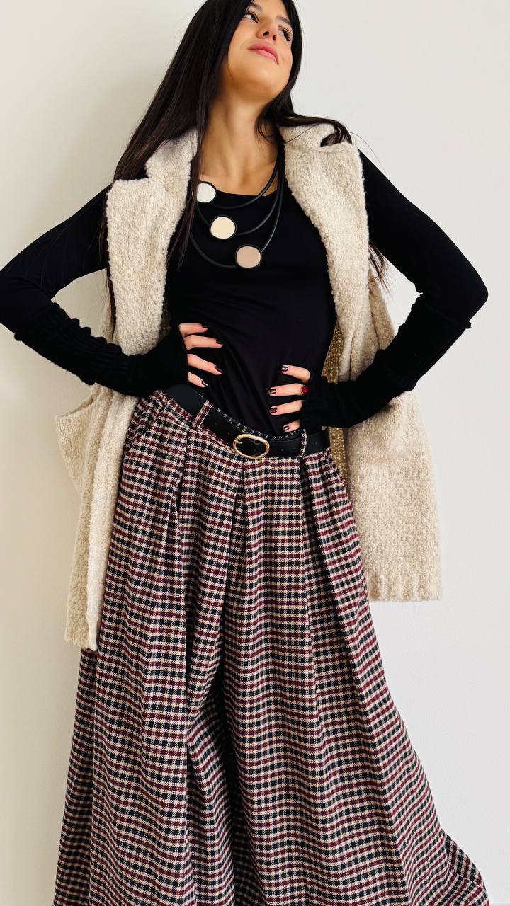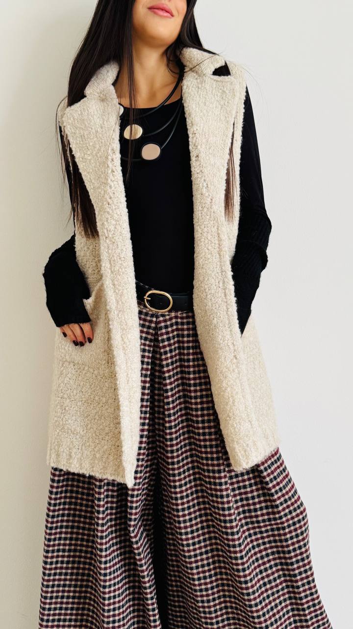 Spolverino smanicato in bouclรจ realizzato in acrilico, pl, viscosa, lana e alpaca ideale da indossare sopra giacche e blazer. Taglia unica consigliata fino alla 46/48. Made in Italy.
