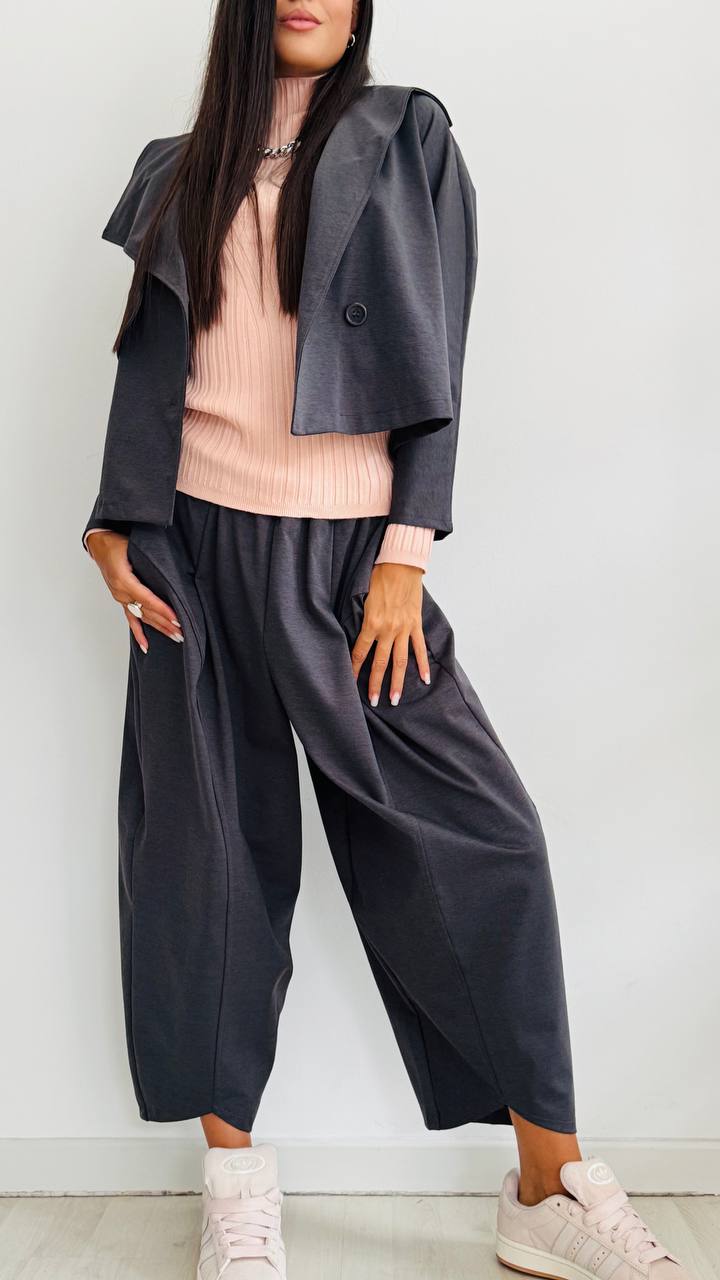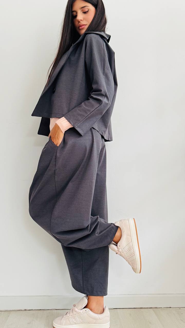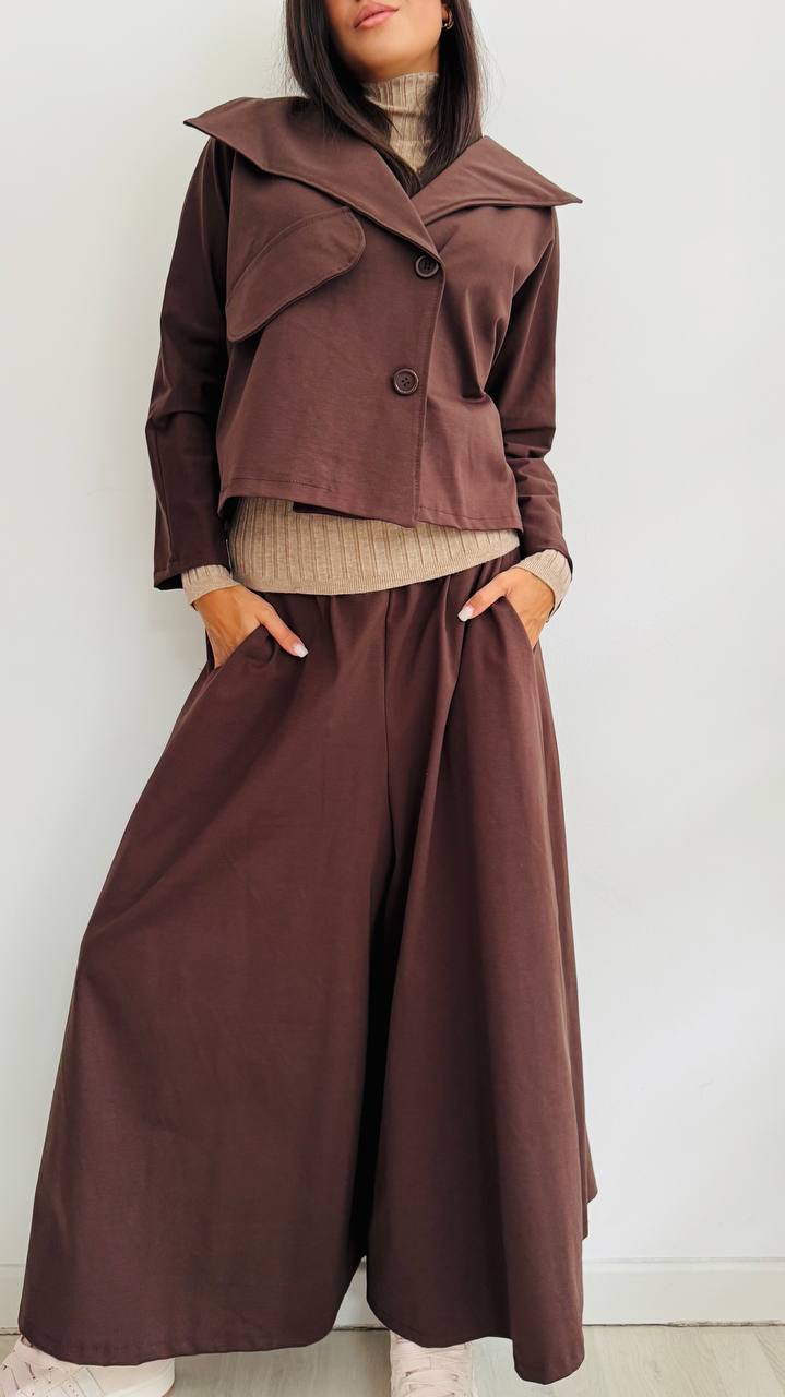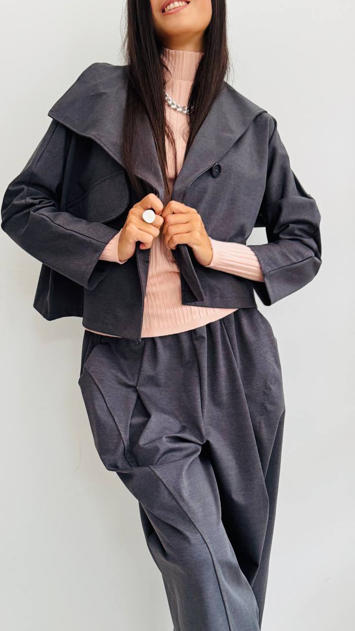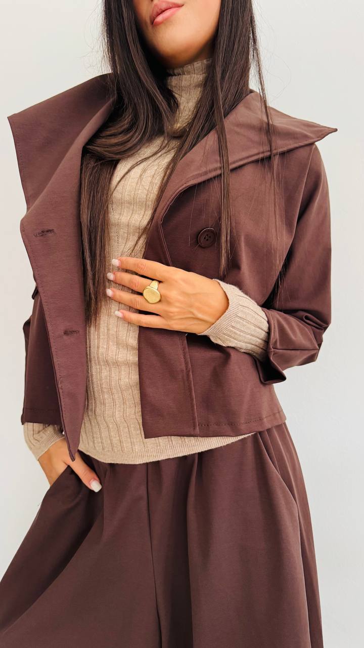 DESCRIZIONE – Spolverino crop – Tasca finta e bottone – Vestibilità morbida – TAGLIA UNICA consigliata fino alla 46/48 – Materiale: Cotton tecnic Punto Milano – MADE IN ITALY