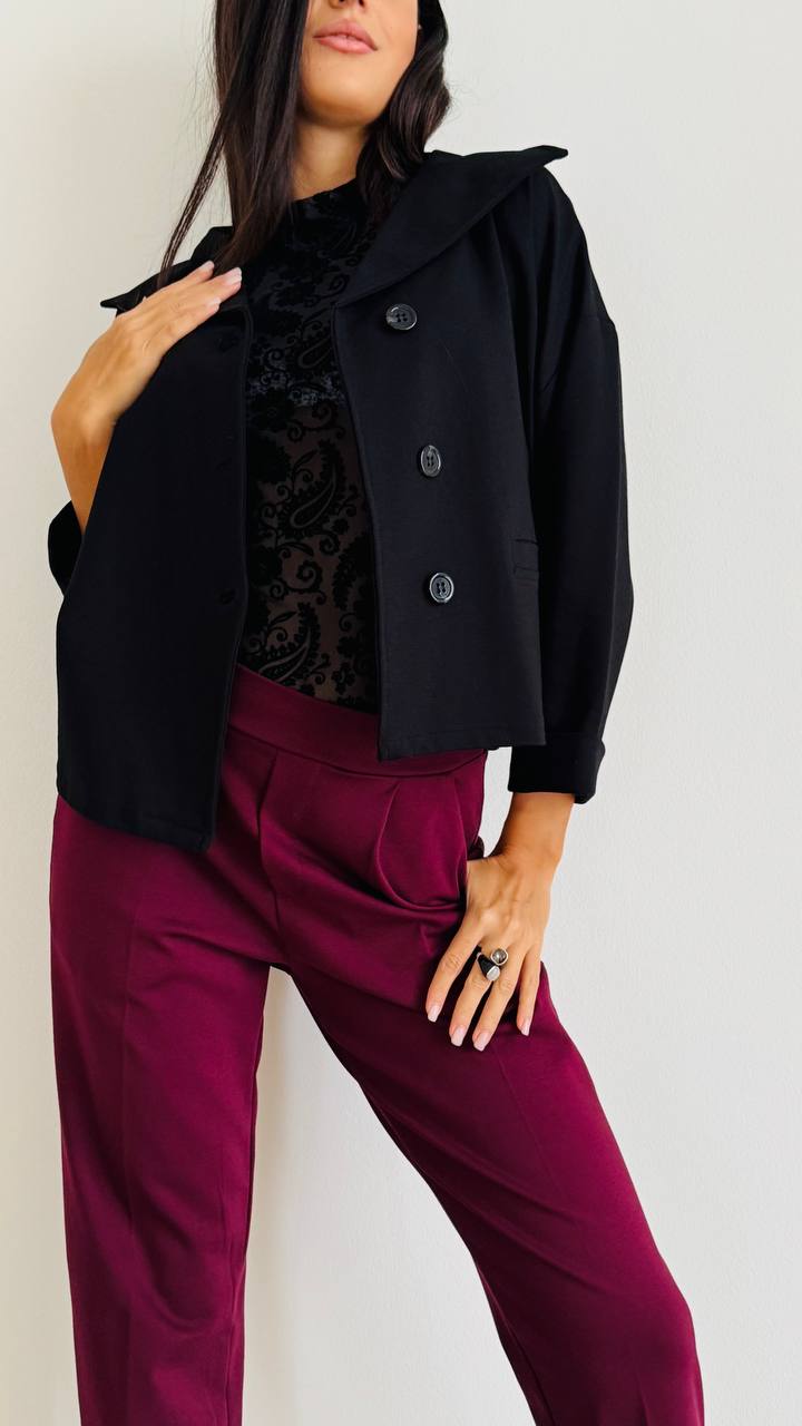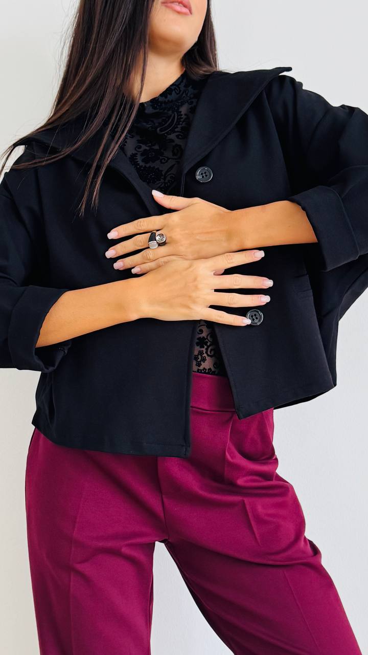 Blazerino corto con taglio a scatoletta realizzato in viscosa tecnic punto milano. Taglia unica consigliata fino alla 46/48. Made in Italy