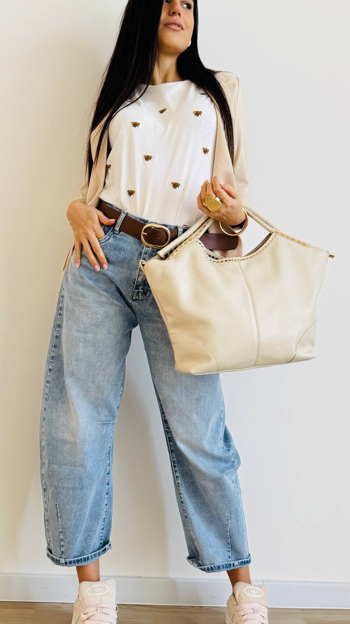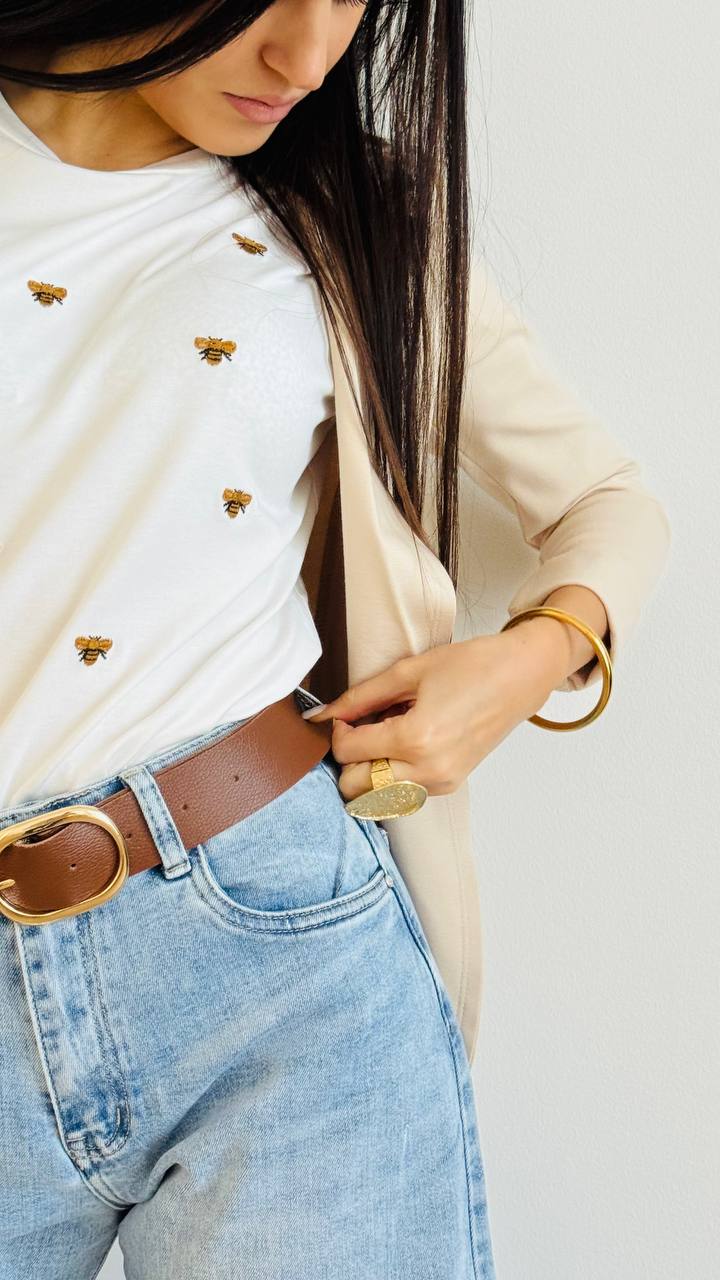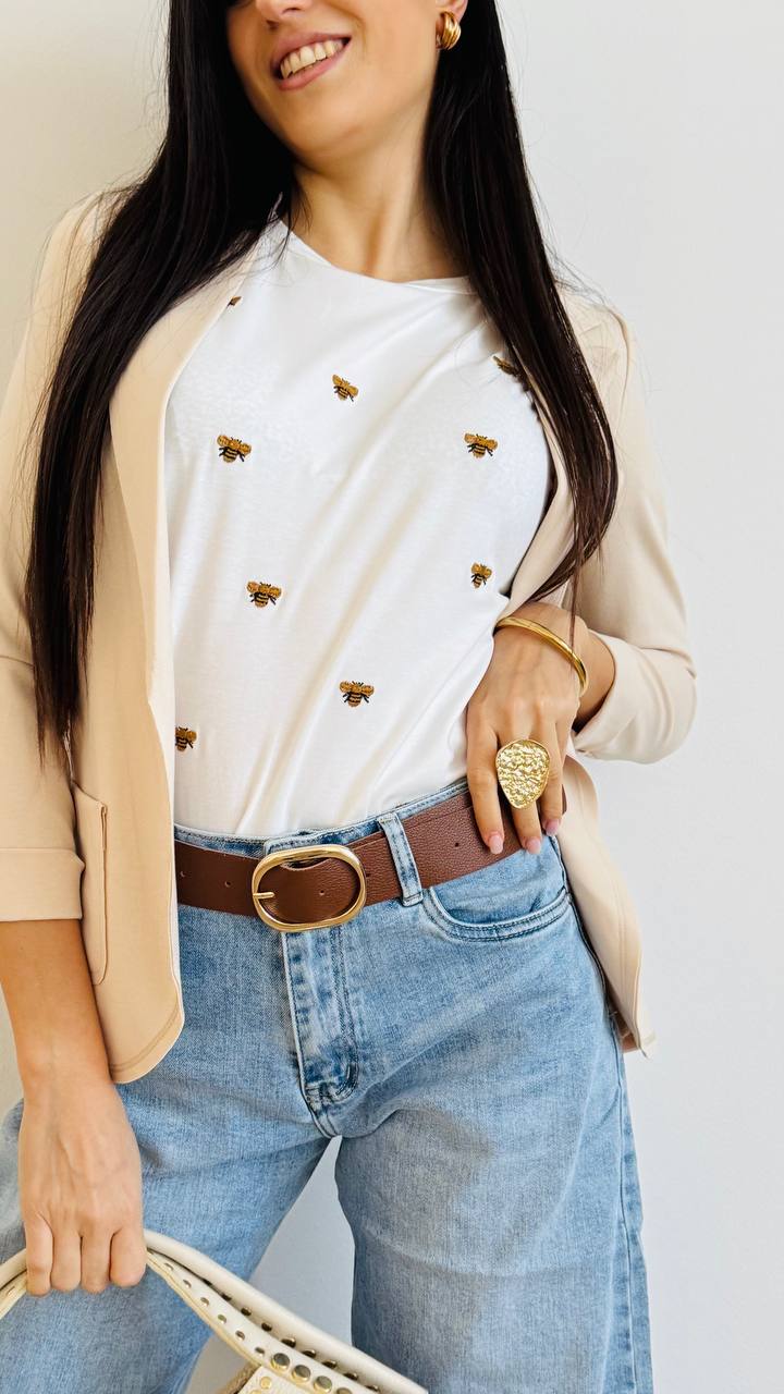 T-shirt mezza manica realzizata in cotone con piccole applicazioni.