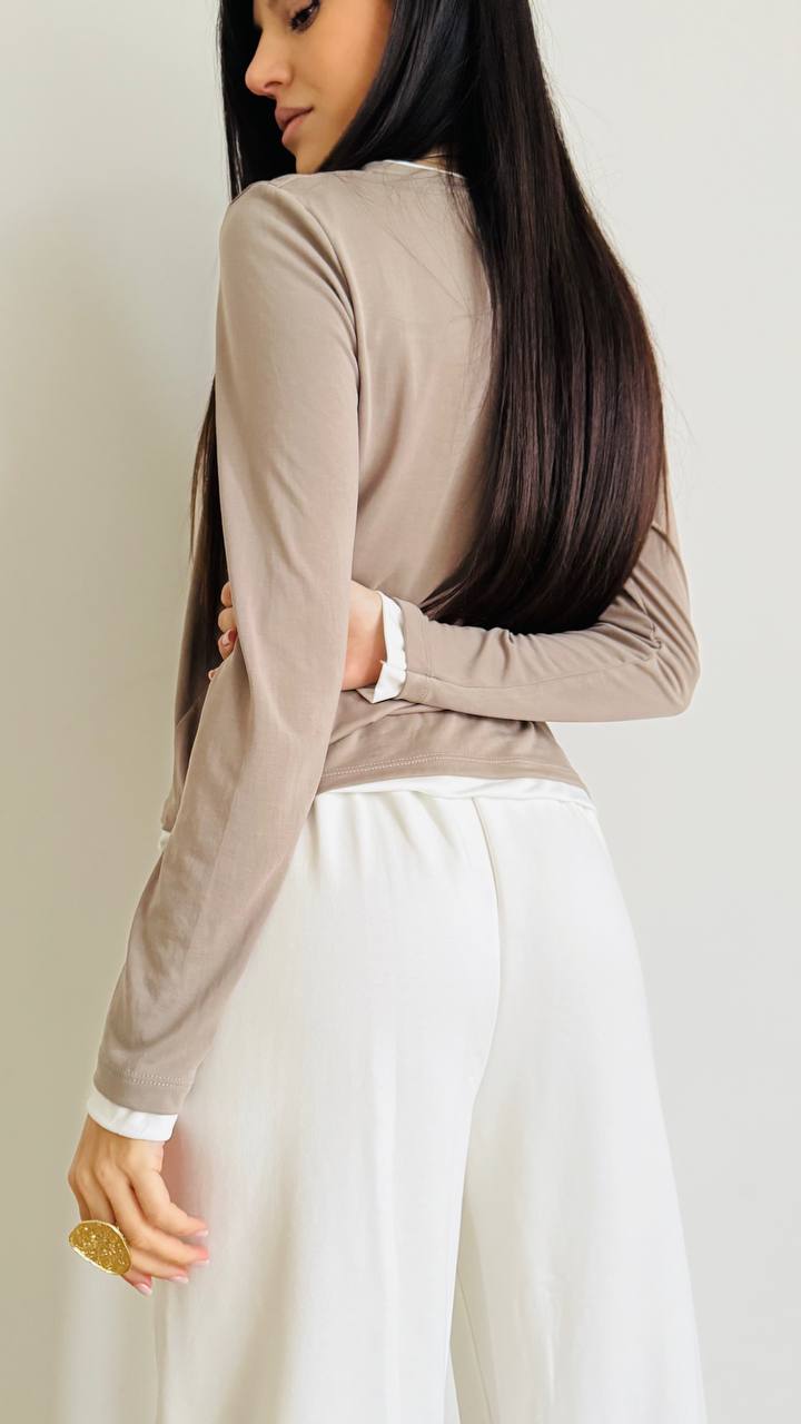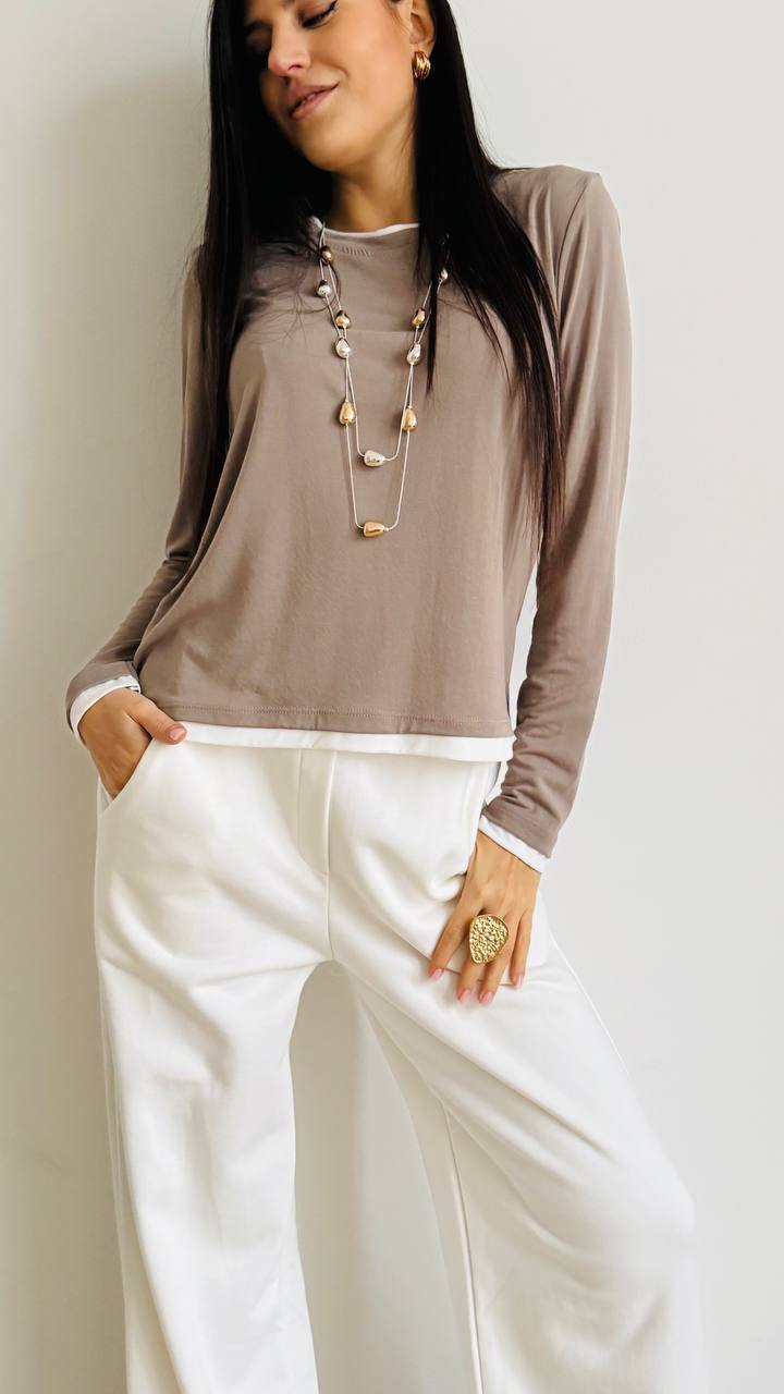 Maglia girocollo con profili doppi realizzata in misto modal. Taglia unica consigliata fino alla 46. Made in Italy.